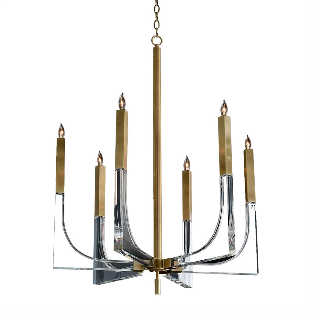 6-light clear acrylic chandelier with Antique Brass accents.