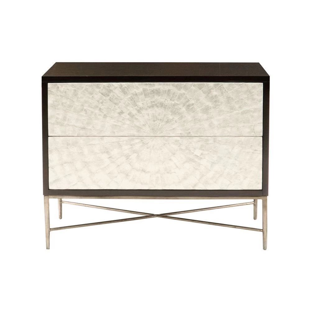 Espresso finished two touch-to-open drawer chest with inlaid Capiz shell drawer fronts and Bronze finished steel base.