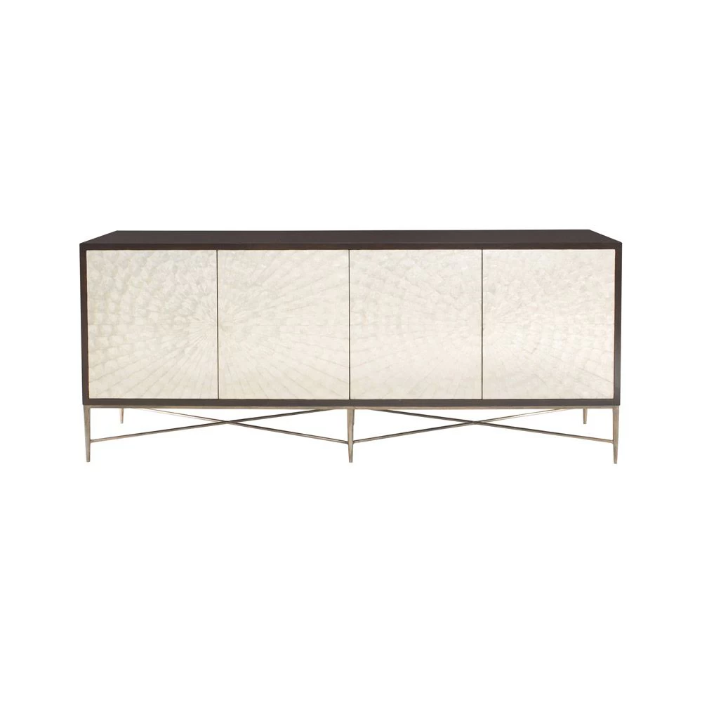 Espresso finished four door buffet with inlaid Capiz shell on front doors and Bronze finished metal base. 3 drawers on one side and an adjustable shelf on the other.