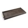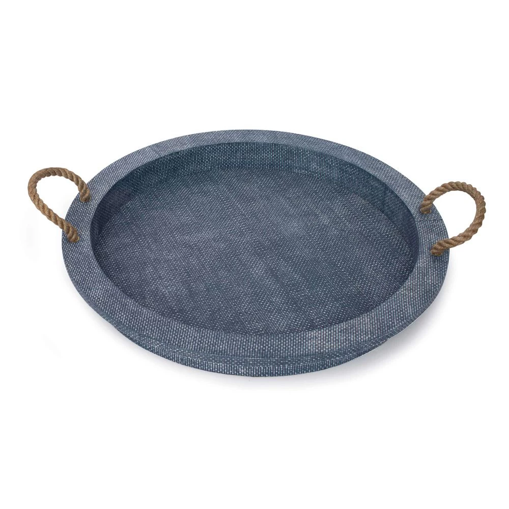 Indigo coloured round serving tray in faux rattan with jute handles. Also available in Grey, Natural and White.