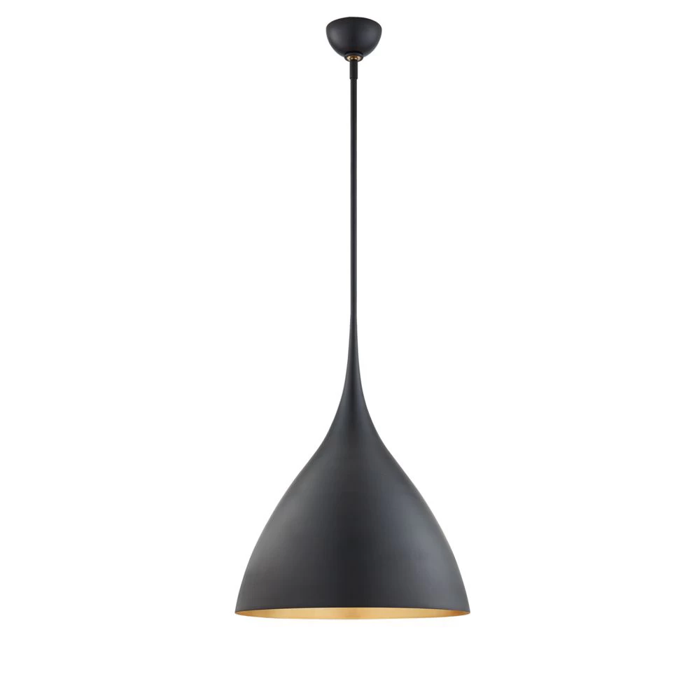 Aerin Lauder design metal pendant in Matte Black with Gild interior. Also available in Plaster White, Burnished Silver or Gild finished shades. Canopy is 4.25 dia. Also available in small and larges sizes.