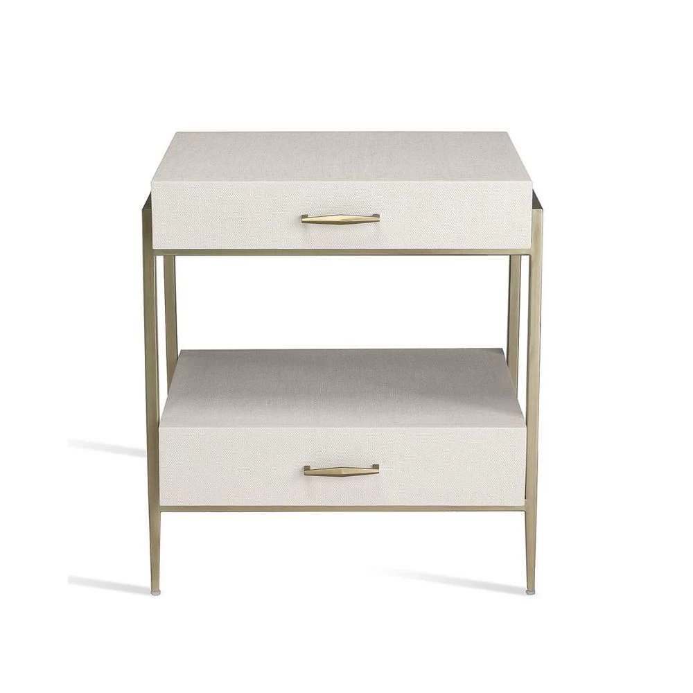 Two drawer nightstand with White Faux Linen covering and Champagne Silver frame and hardware.