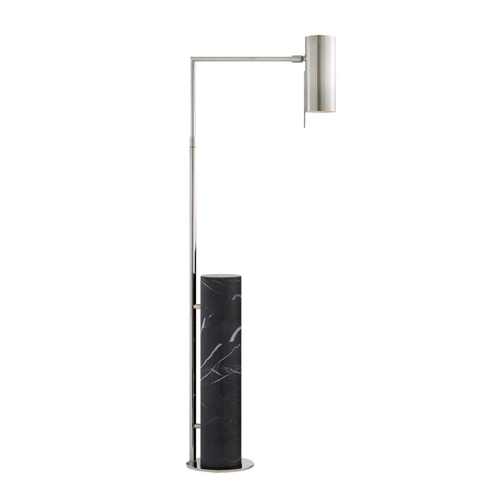 Kelly Werstler design metal and marble adjustable floor lamp in Polished Nickel with Black Marble base. Also available in Antique Brass finish with White Marble base.