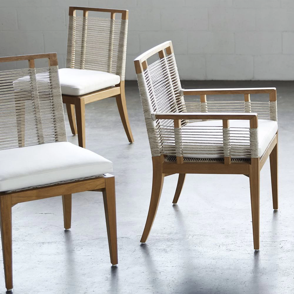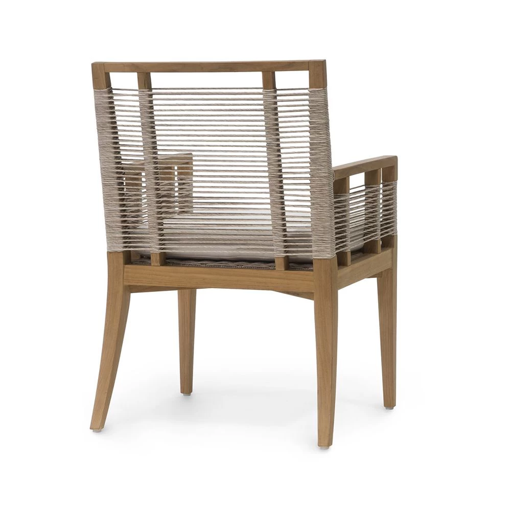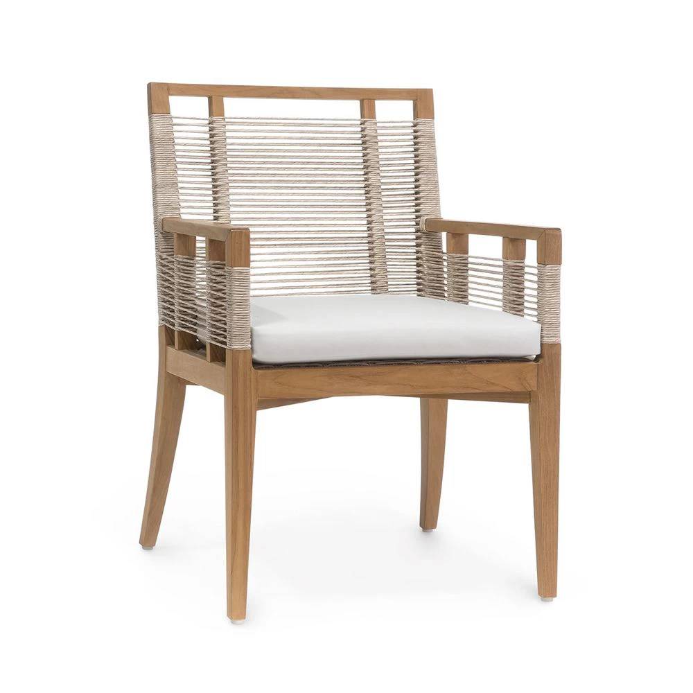 Outdoor dining arm chair with Teak wood frame and legs in a natural golden brown finish accented with hand-twisted all-weather synthetic abaca in a latte finish with maximum UV protection. Weave is resistant to cracking, peeling, fading, breaking, and stretching. Chair comes with a loose seat cushion.