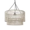 Teak wood frame side table in a natural golden brown finish accented with hand-twisted all-weather synthetic abaca in a latte finish with maximum UV protection. Weave is resistant to cracking, peeling, fading, breaking, and stretching.