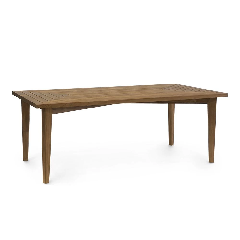 Teak wood outdoor dining table in a natural golden brown finish. Natural teak wood is a golden brown color and over time, with exposure to the elements, it will gradually change to a silvery gray patina which distinguishes finely aged outdoor teak.