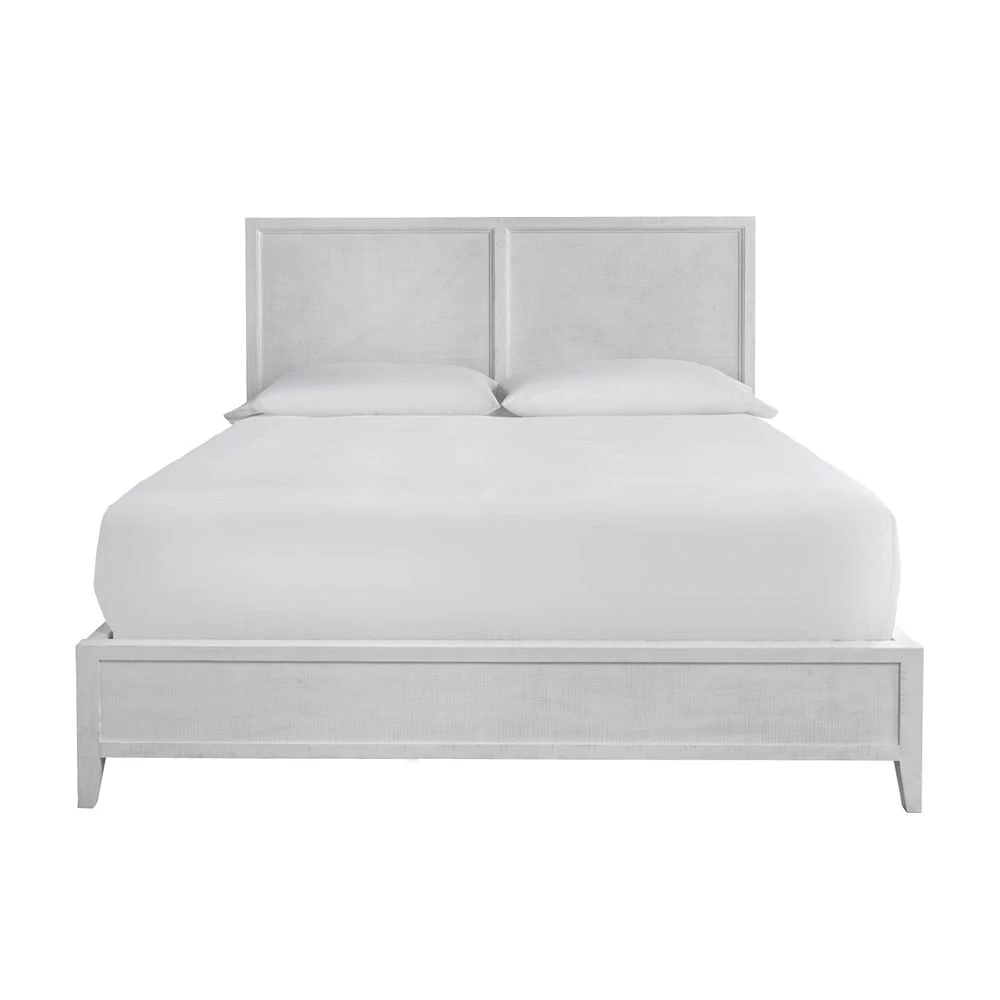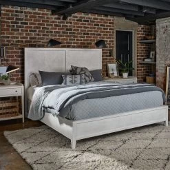 Modern Farmhouse collection queen bed finished in white Rustic Oak. Optional slat roll available for mattress only use. Also available in King size.