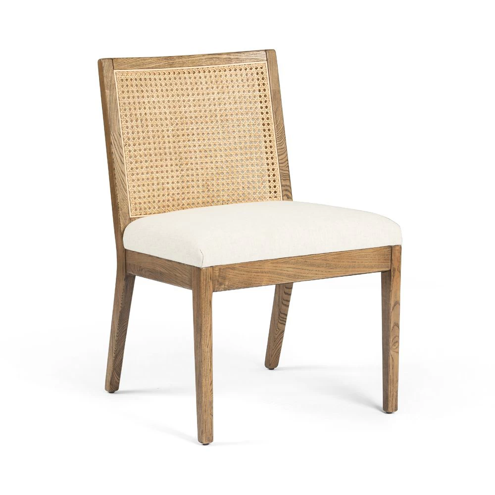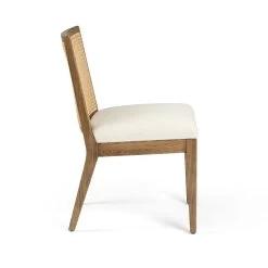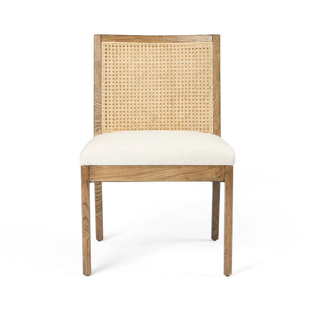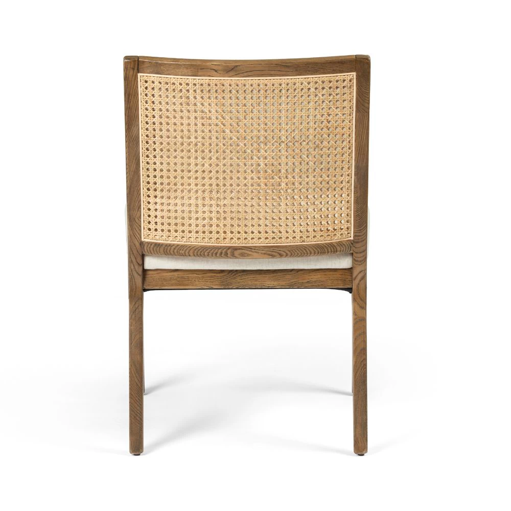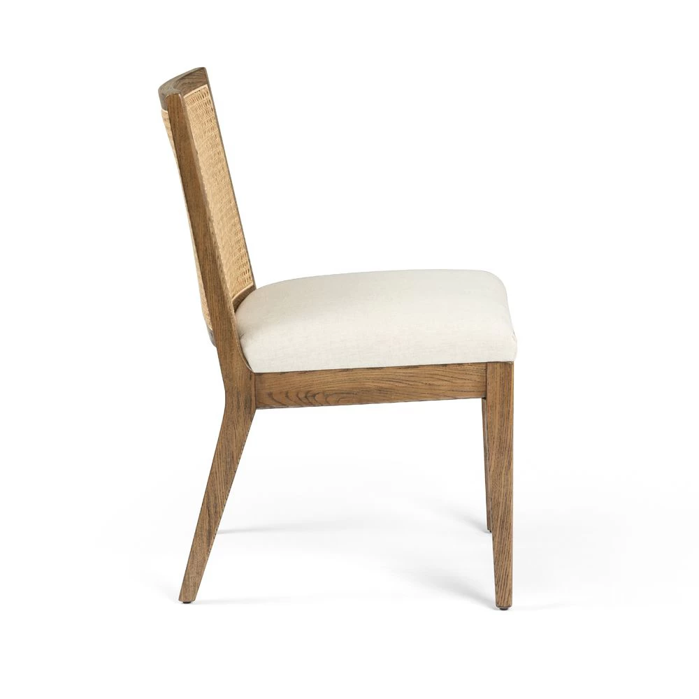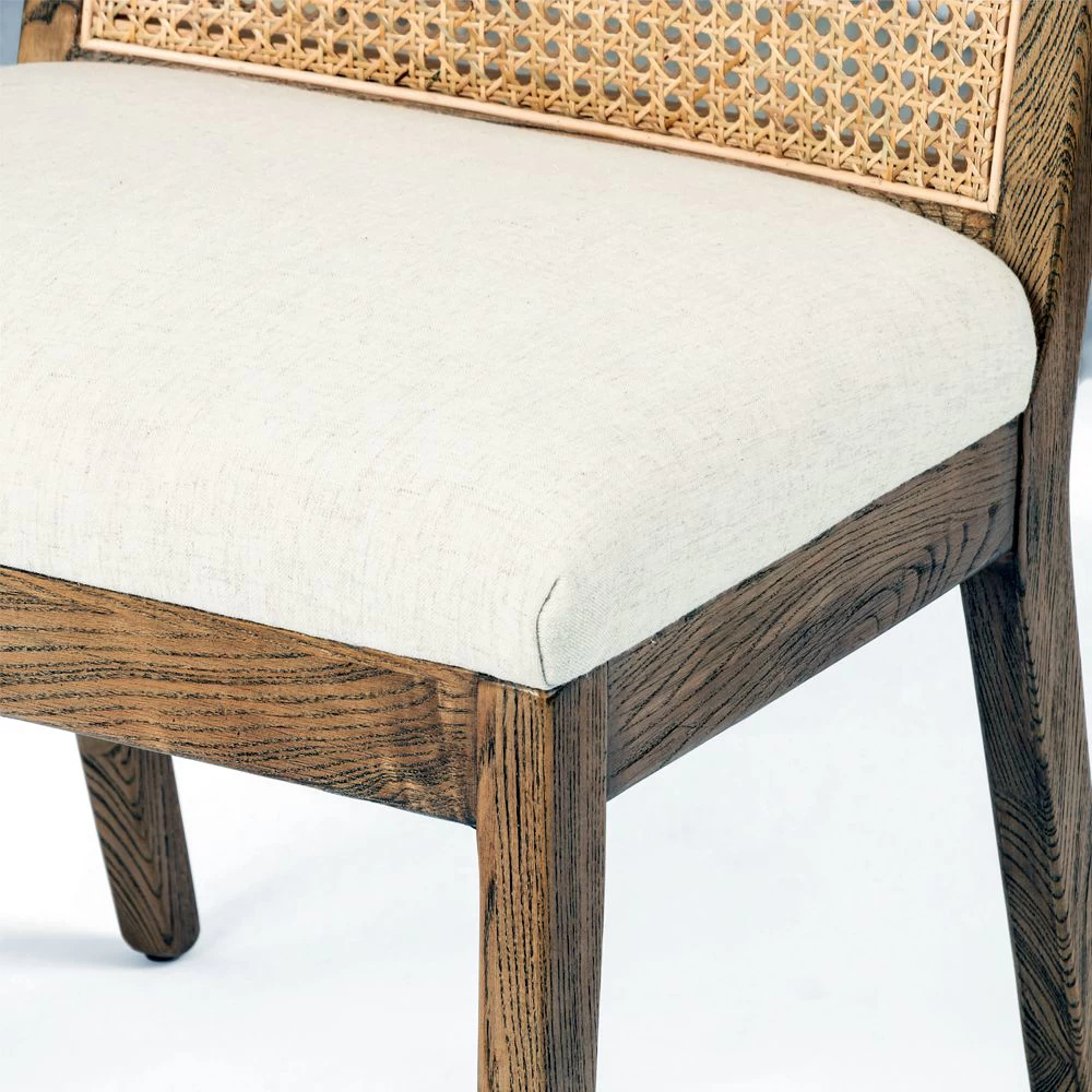 Armless dining chair in Toasted Parawood with Natural Cane back and Saville Flax upholstered seat.