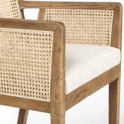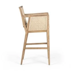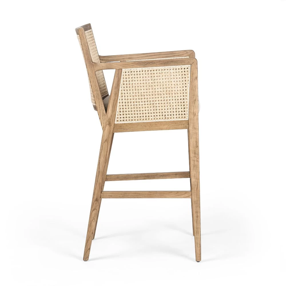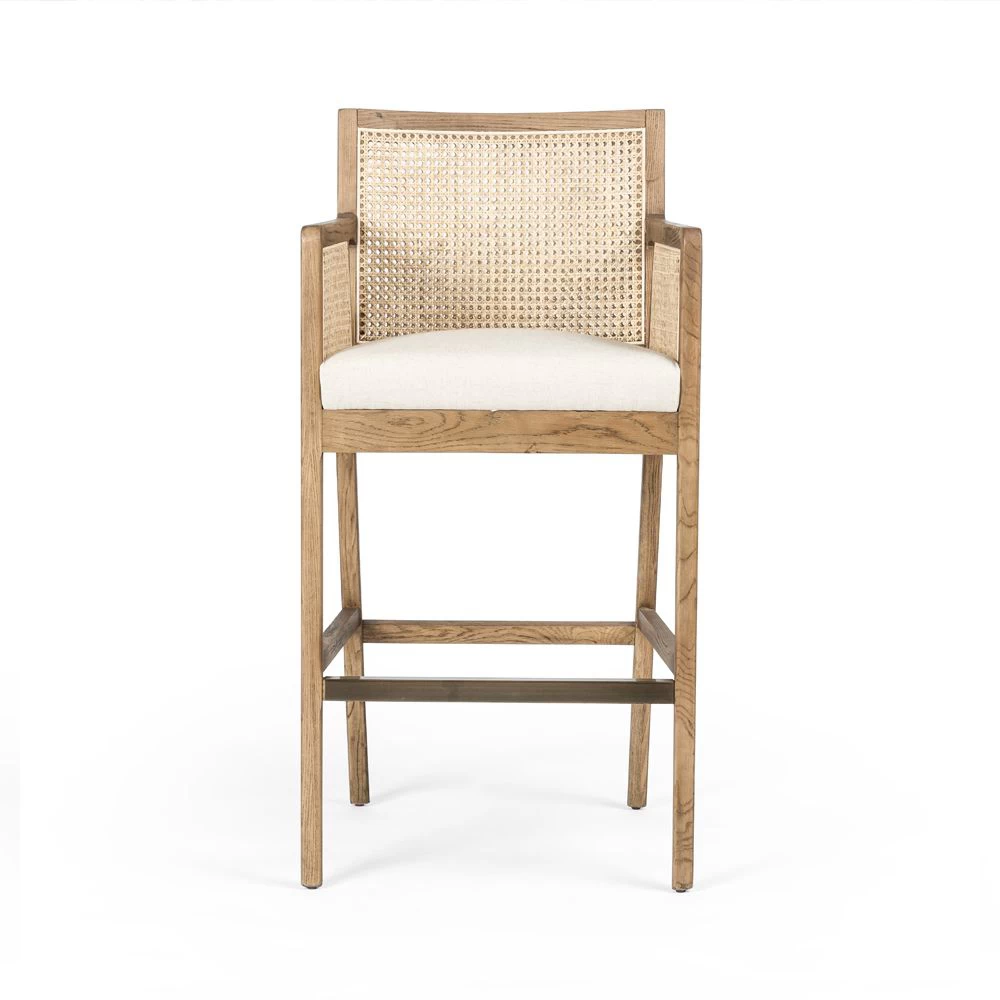 Bar stool in Toasted Parawood with Natural Cane back and Saville Flax upholstered seat. Also available in Counter Stool height.