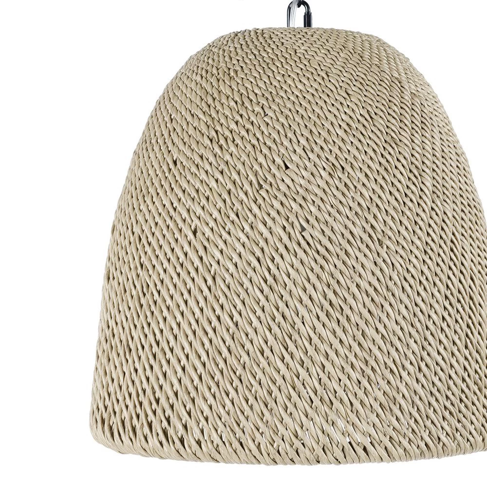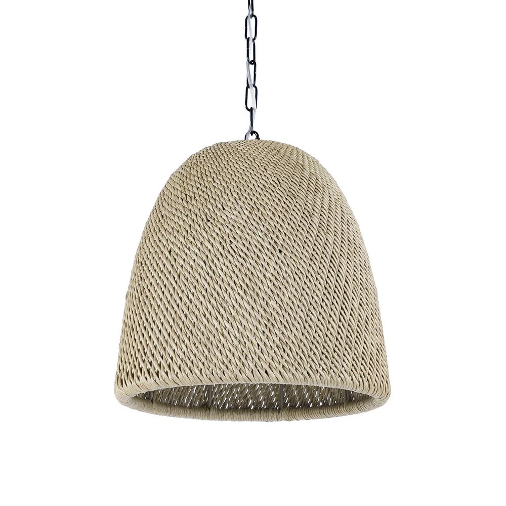 Pendant in powder coated metal frame intricately hand-twisted with all-weather synthetic wicker in seagrass color. Chandelier comes with a matte black 9′ finished chain and 5″ dia. canopy hanging kit. Suitable for covered outdoor use in a damp location with no direct water contact.
