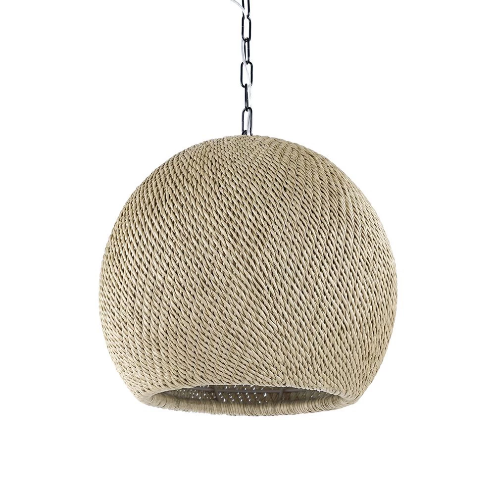 Pendant in powder coated metal frame intricately hand-twisted with all-weather synthetic wicker in seagrass color. Chandelier comes with a matte black 9′ finished chain and 5″ dia. canopy hanging kit. Suitable for covered outdoor use in a damp location with no direct water contact.