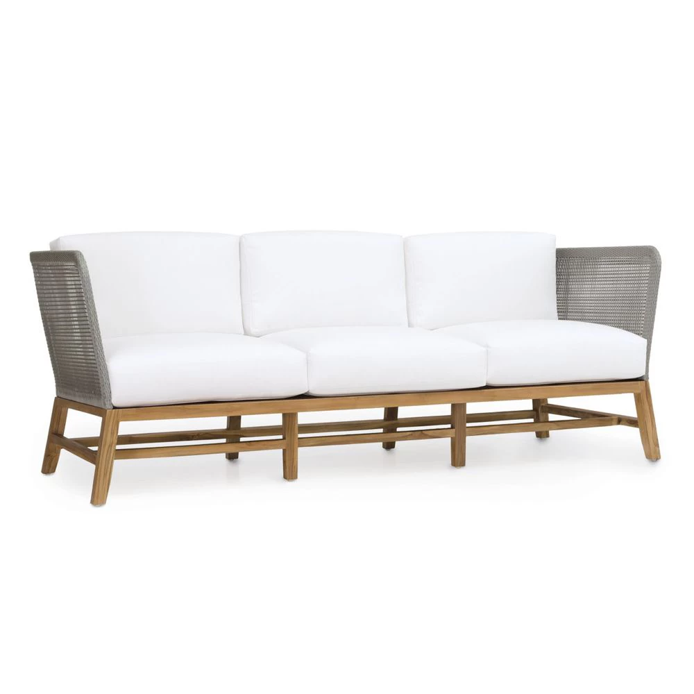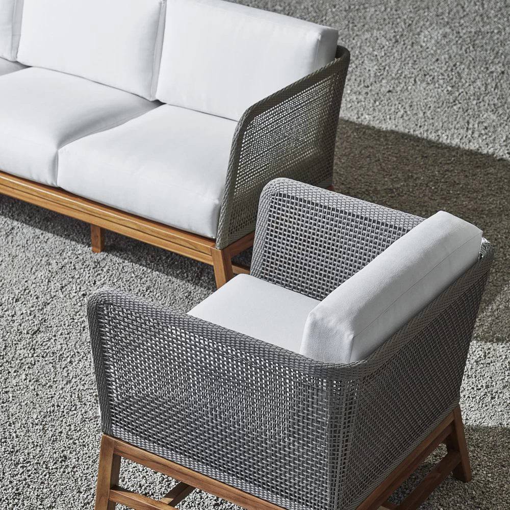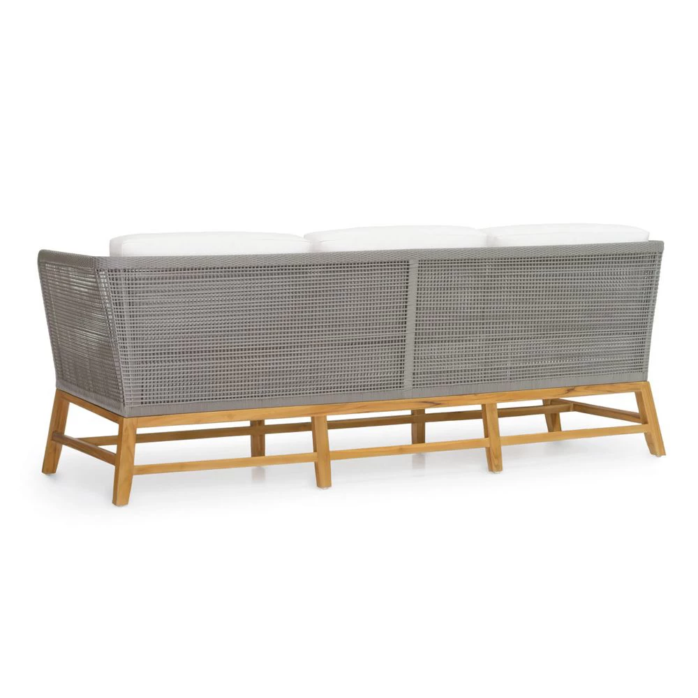Teak wood frame sofa in natural golden brown finish. Double wall back with woven marine grade synthetic rope in grey with maximum UV protection. Chair comes with loose seat and back cushions.
