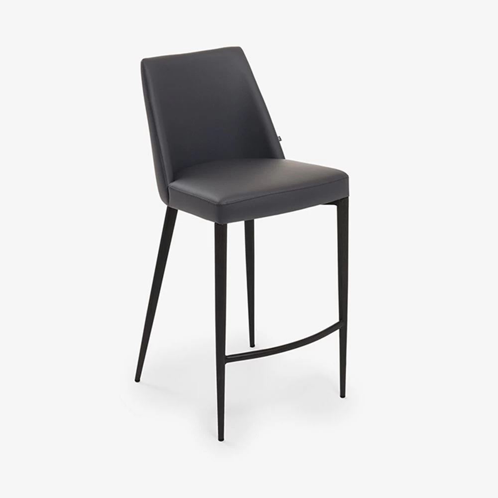 Black metal counter stool with upholstered seat in Black faux leather (Coro 029). Available in Smoked Walnut metal frame and in other faux leathers and fabrics. Seat height is 26″.
