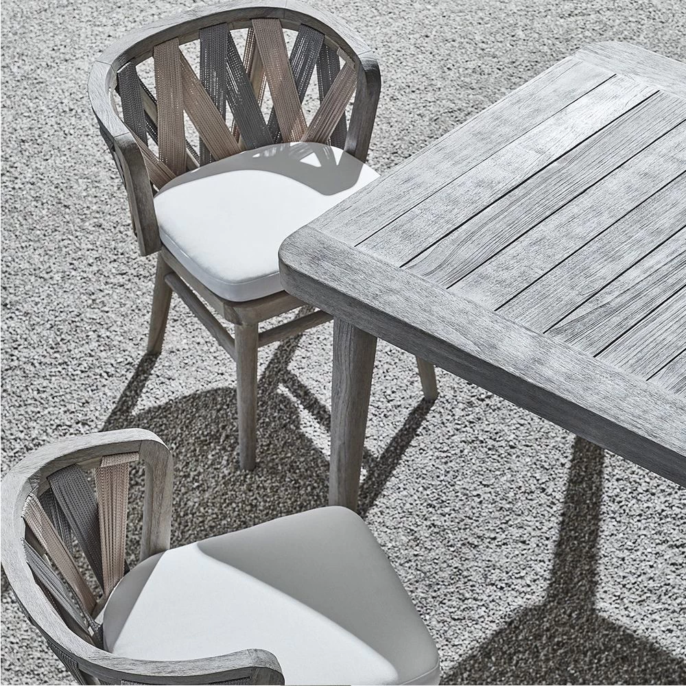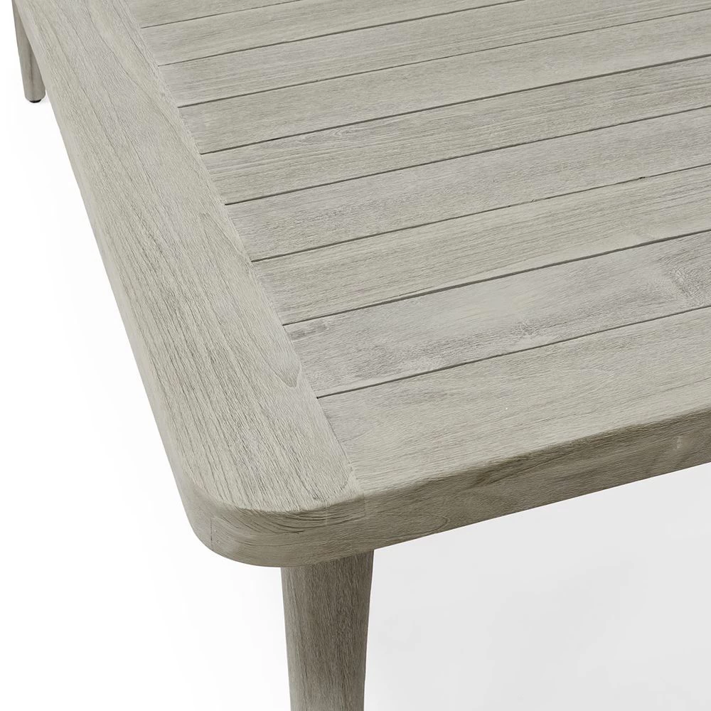 Rectangular outdoor dining table with teak wood slat top and legs in a weathered grey finish.