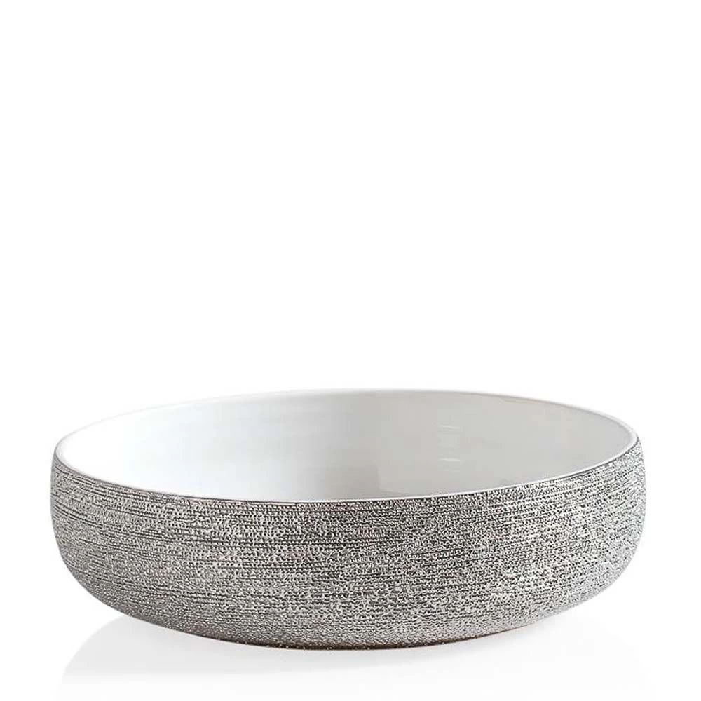 Textured metallic silver ceramic bowl with a smooth white interior.