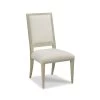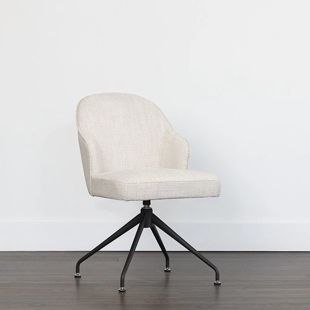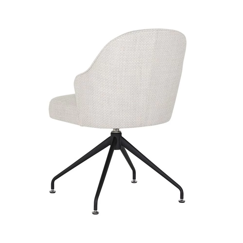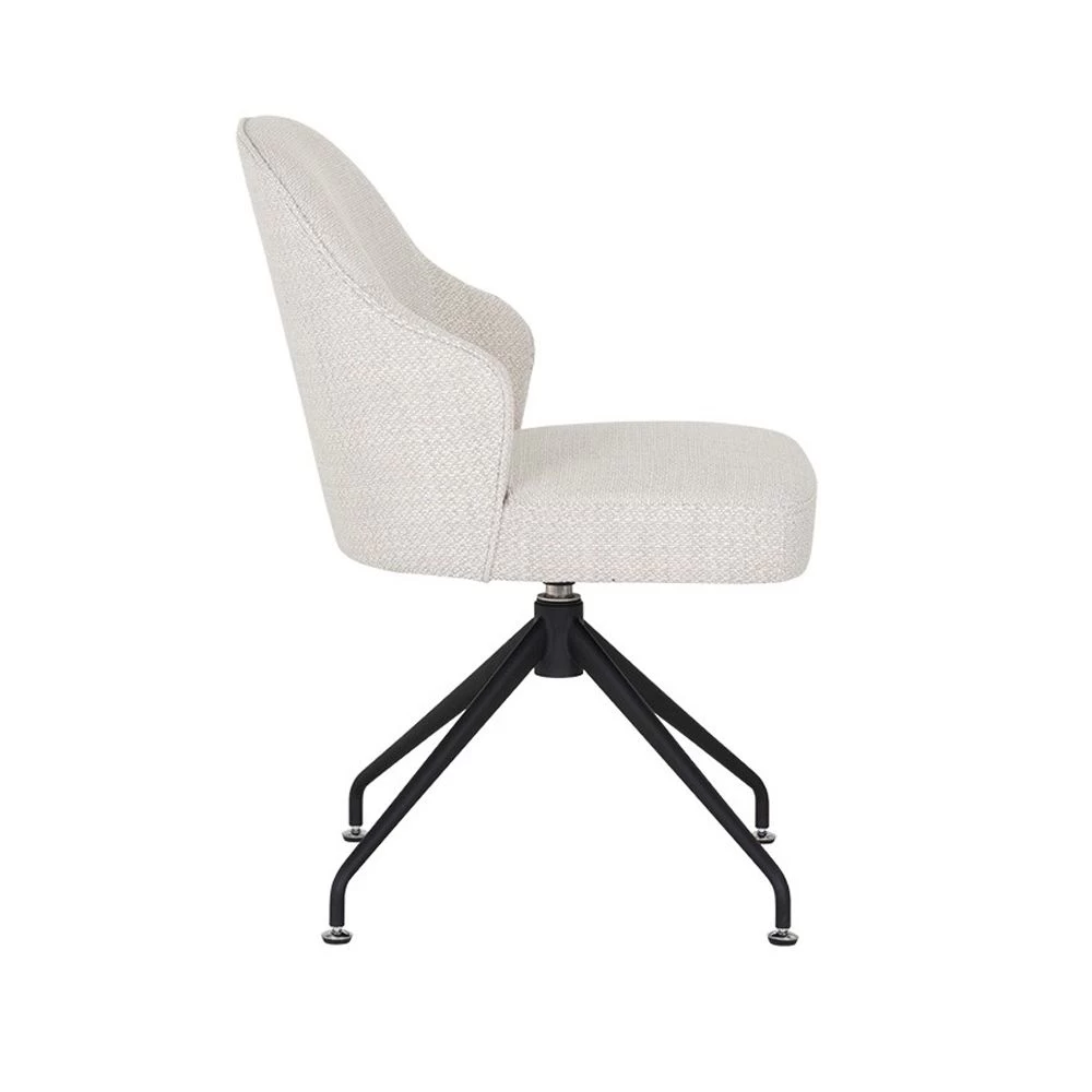 Upholstered swivel chair in Motto Stucco white fabric and Black iron finished base.