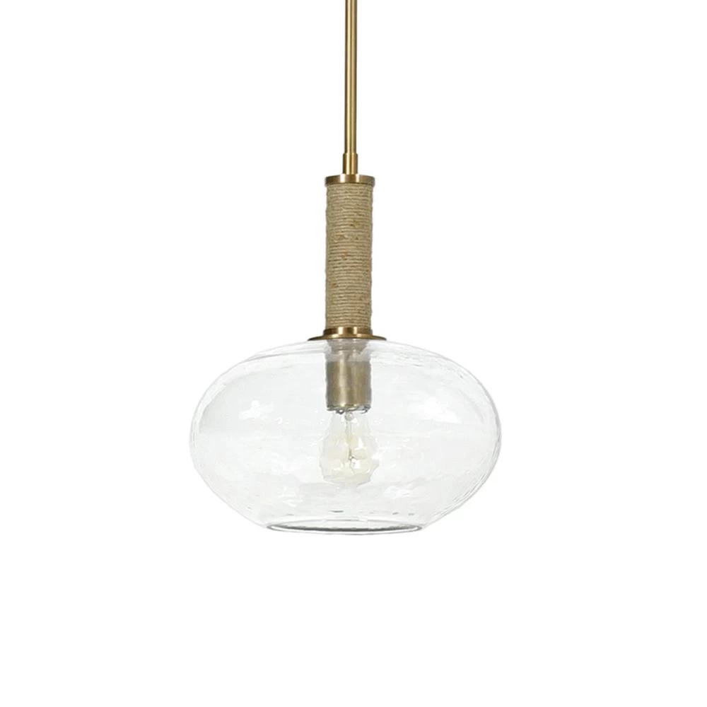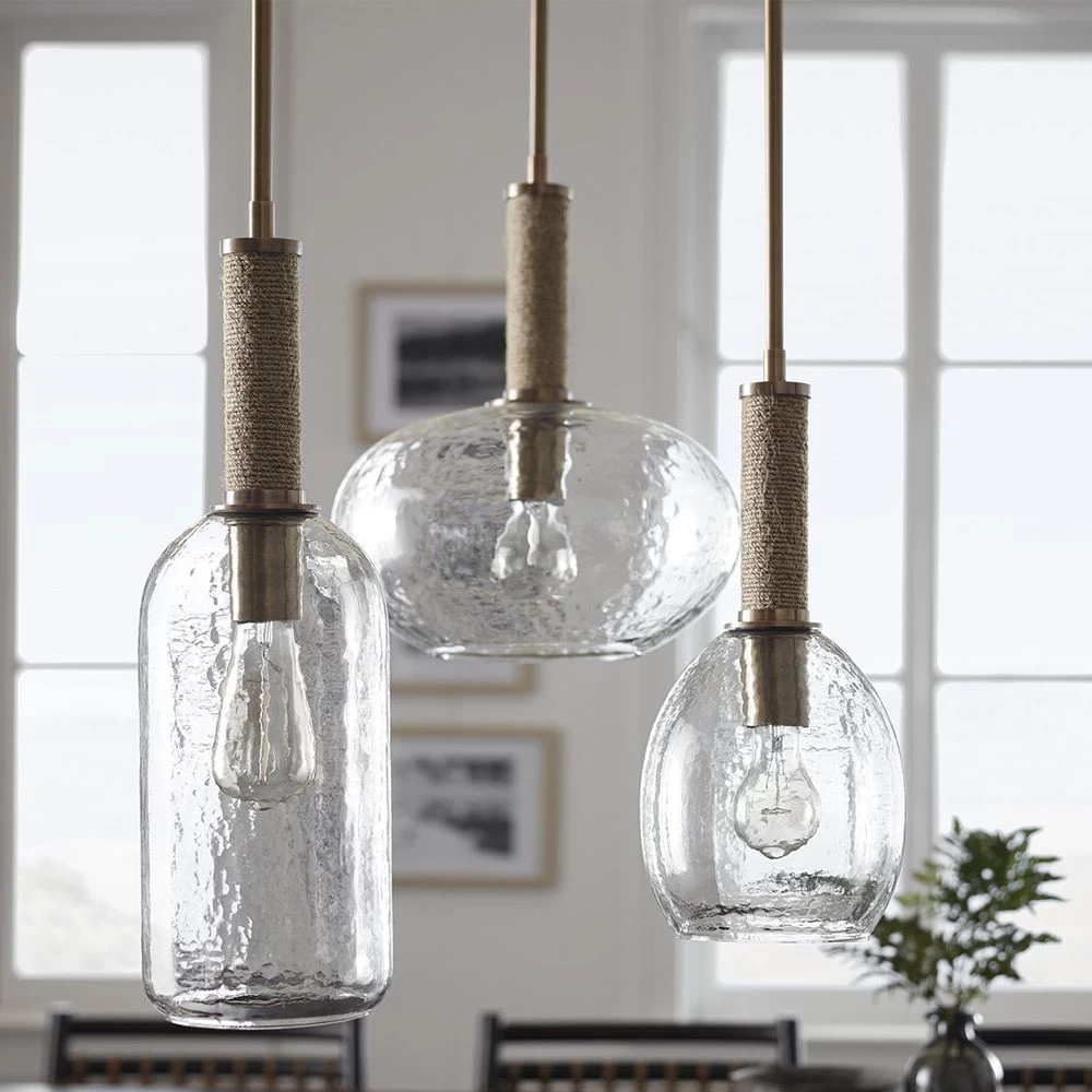 Kirk Nix collection fully adjustable pendant features a hand blown rippled glass shade accented with antique brass details and natural jute rope. Antique brass canopy kit includes rods in 24″, 12″ and 3″ lengths for customizable hanging heights. Min. hanging height of 20″ to maximum of 71″.