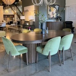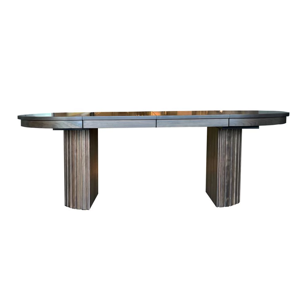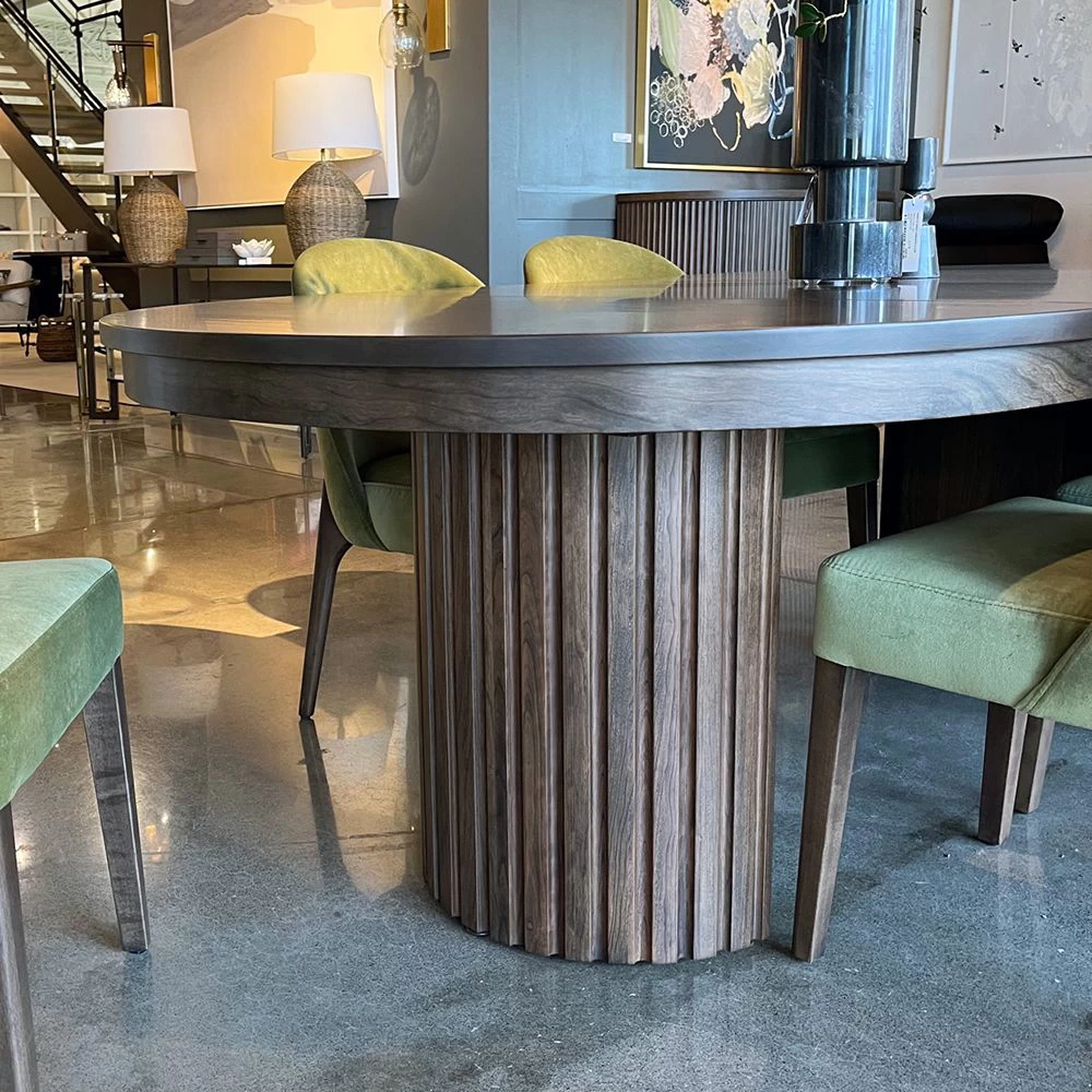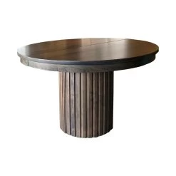 Round center split-pedestal dining table that opens to 88″ wide with 2 – 20″ center leaves on a fluted base.