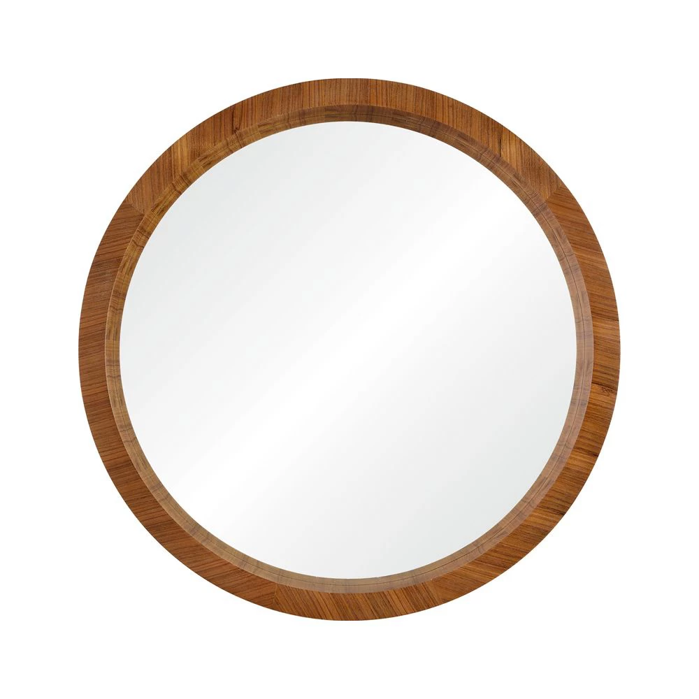 Round walnut veneer finished wood mirror frame with clear mirror.