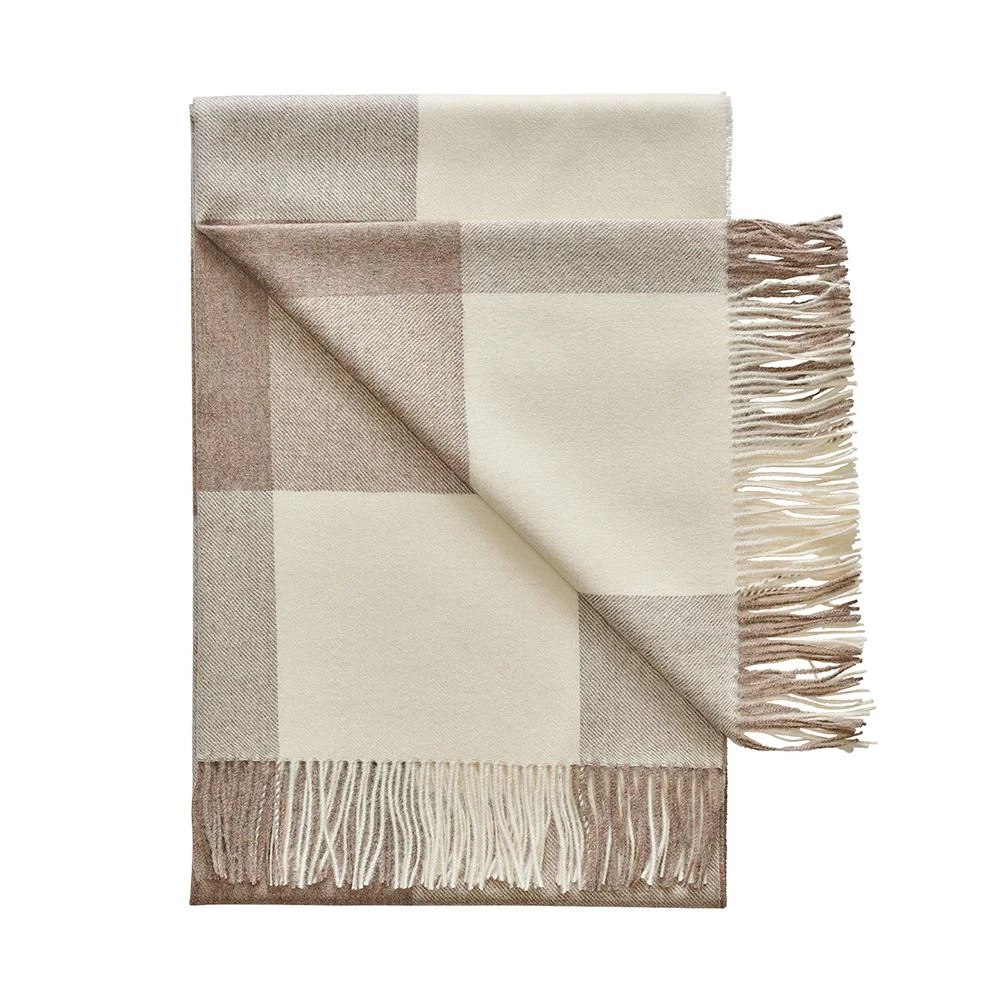 100% Baby Alpaca throw with a Buffalo check pattern in Putty and Ivory colours.