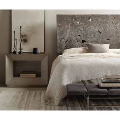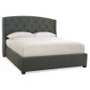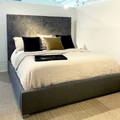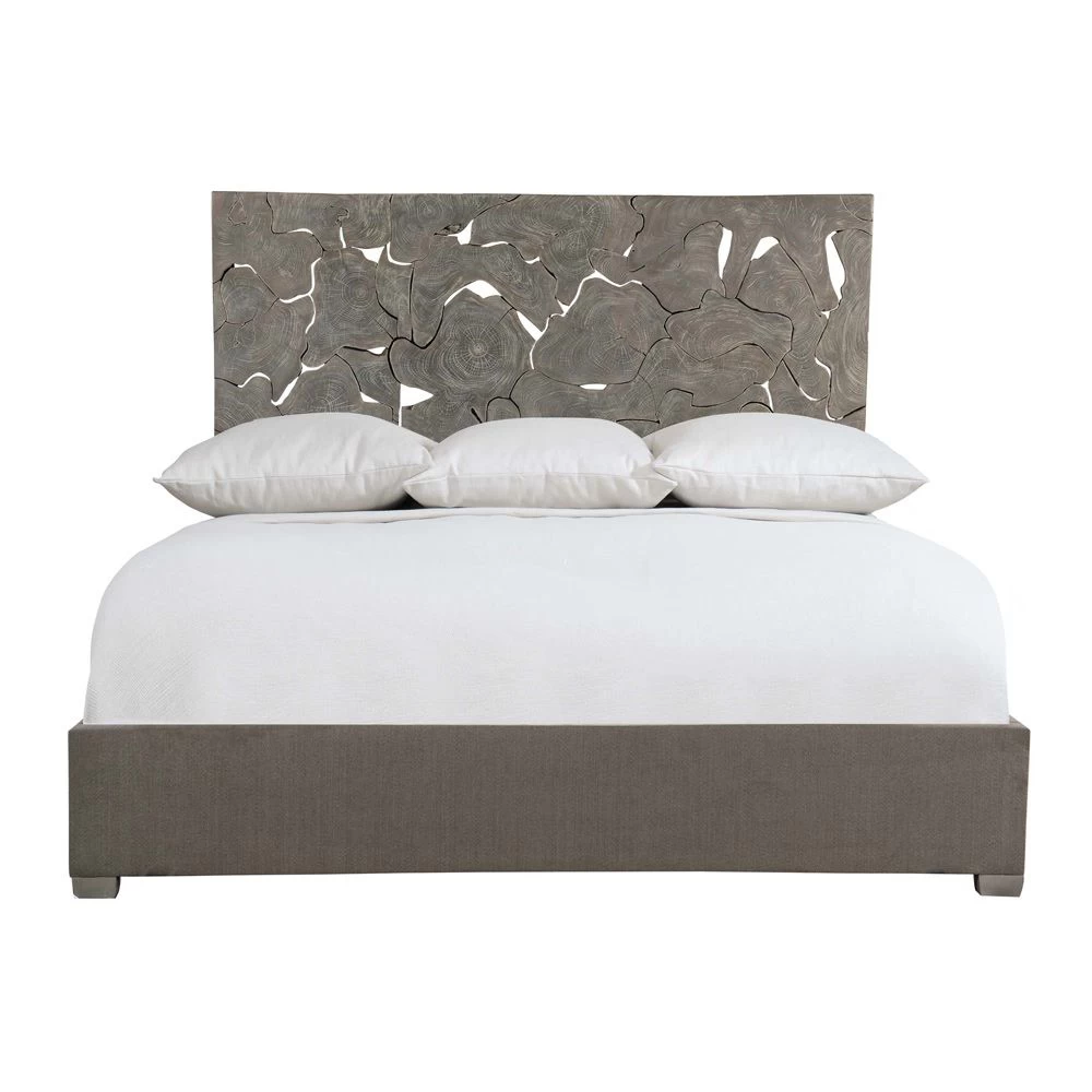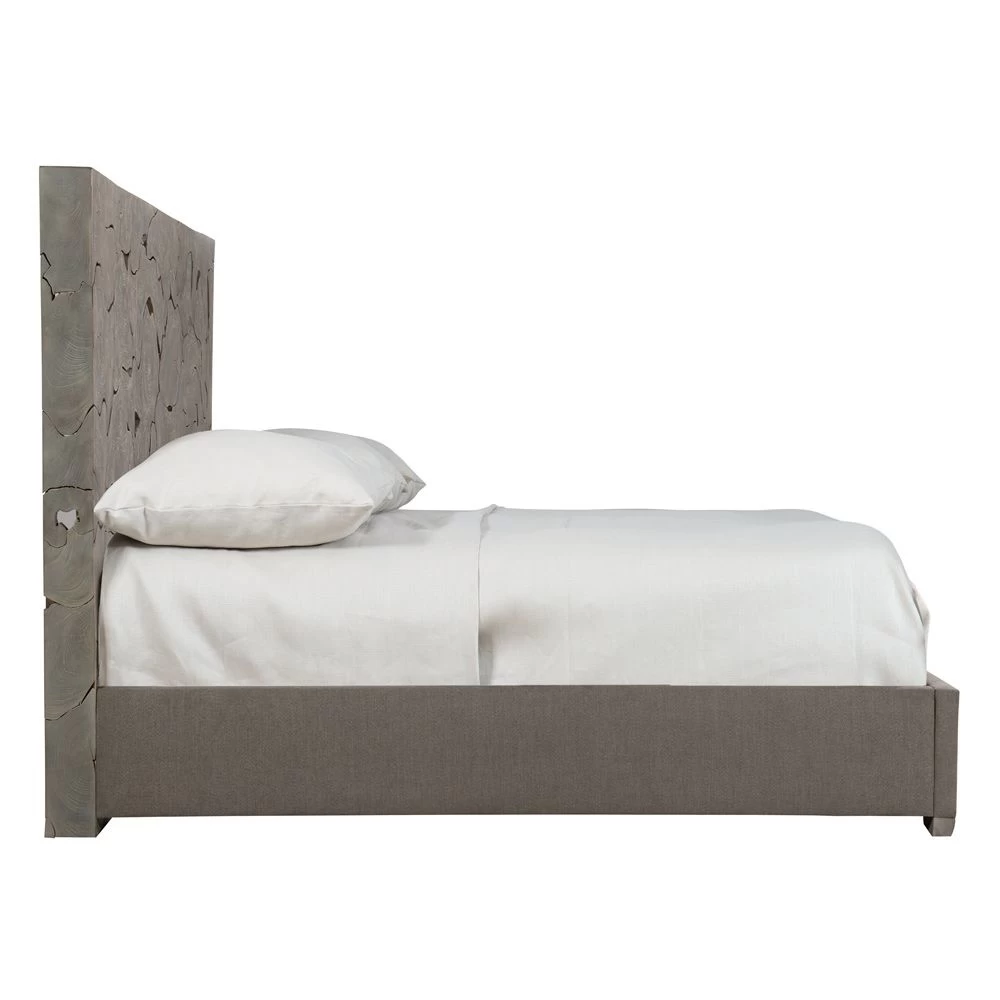 Teak panel king bed with upholstered side and foot rails. Open areas in headboard between teak slices. 3-Slat support system with adjustable center supports. King size only.