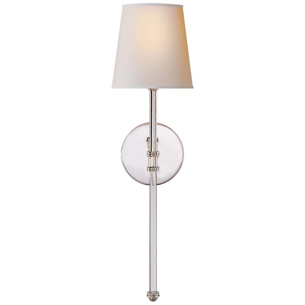 Suzanne Kasler wall sconce with metal and acrylic accent, finished in Polished Nickel with Natural Paper Shade.