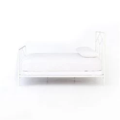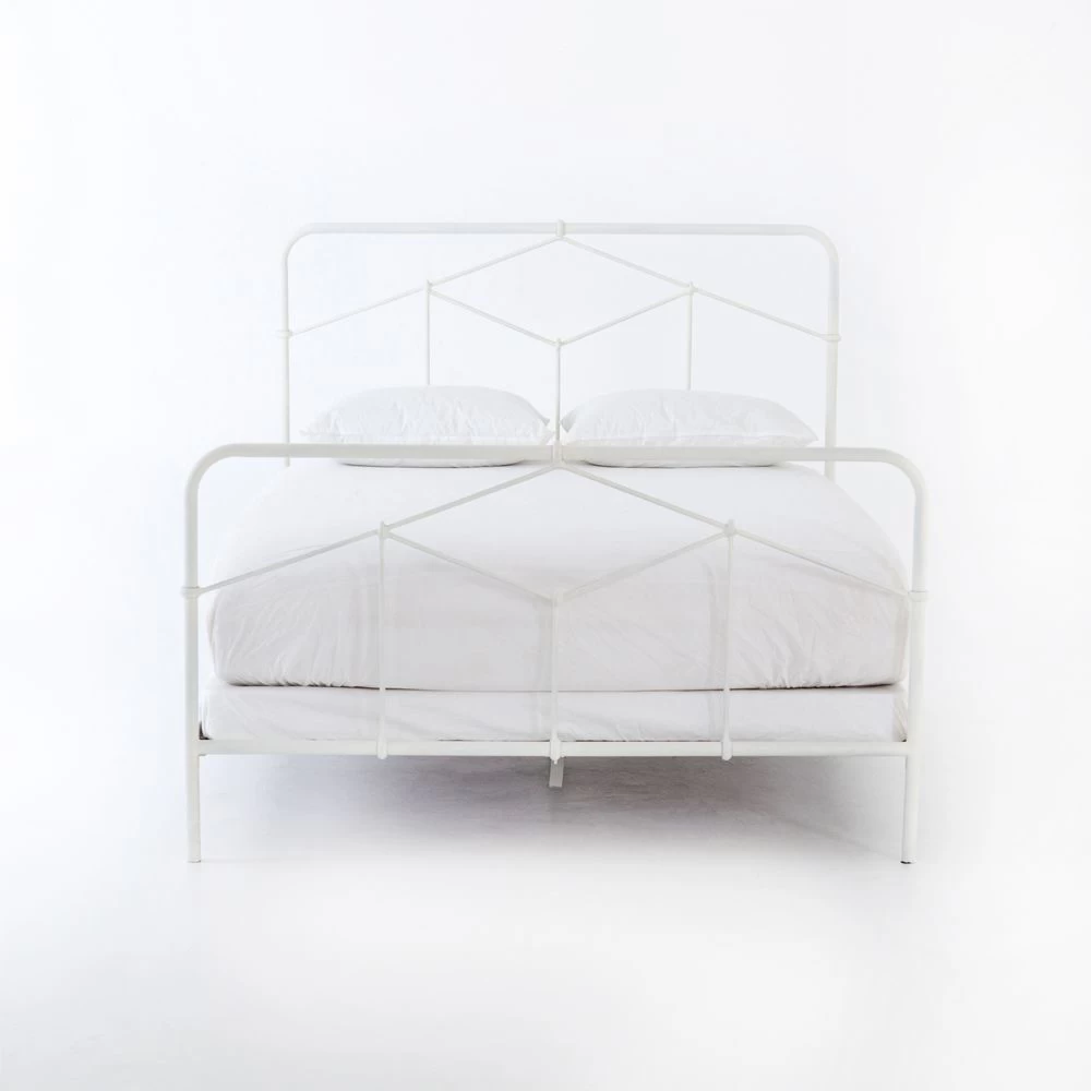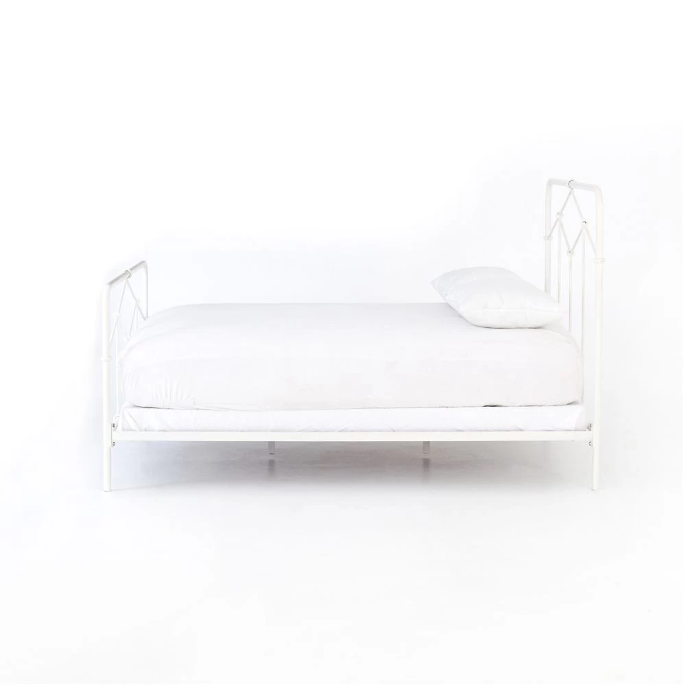 Wrought iron Queen bed in a White finish. Also available in Vintage Black finish and In King, Queen and Twin sizes. Low profile box spring recommended. (Discontinued product).
