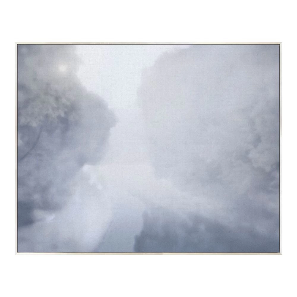 A soft, atmospheric, cool toned landscape canvas painting with a champagne silver edge floating wood frame.