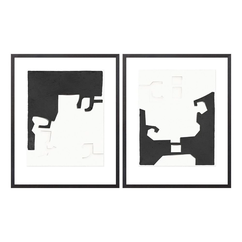 Graphic black and white paper cut outs in a deep frame space with a deep, rough, black profile.