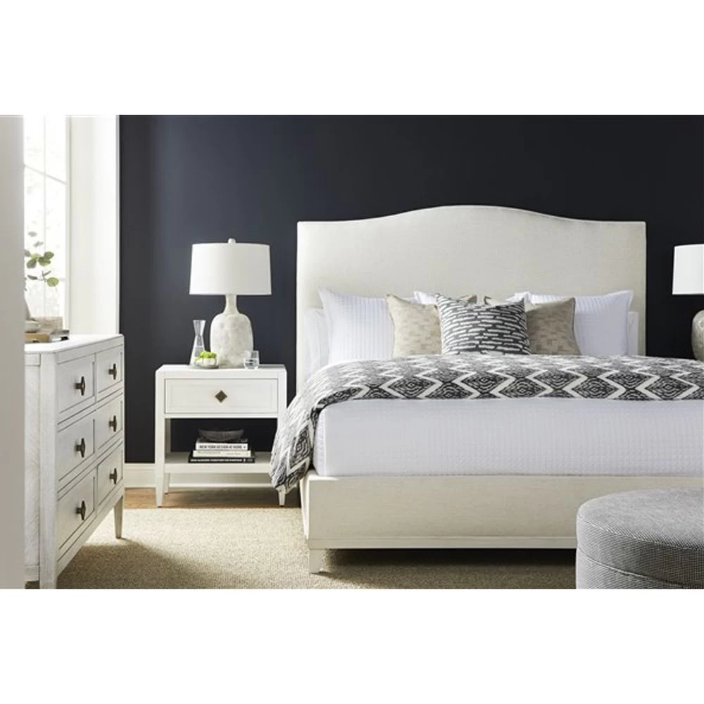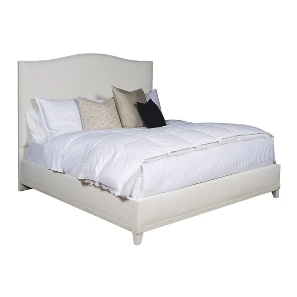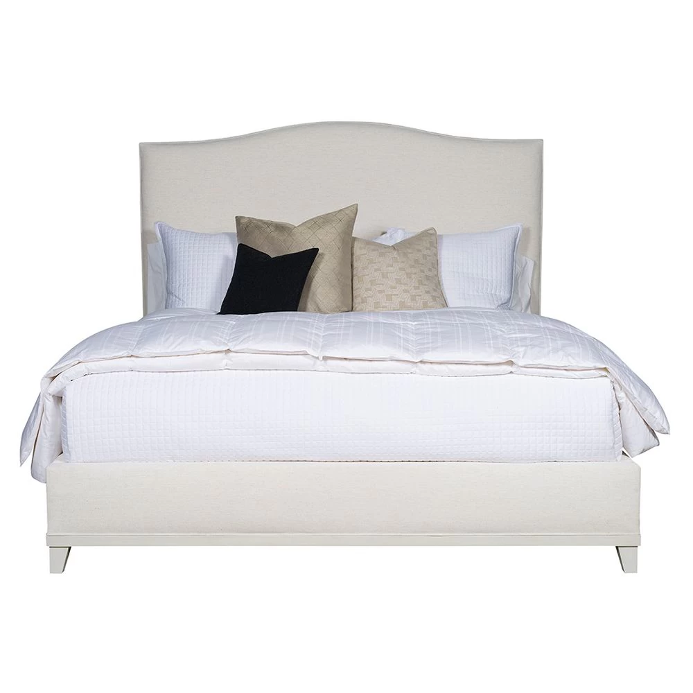 Upholstered King bed with headboard and rails in Nomad Snow fabric and the wood apron and legs in a Casa Blanca finish. Available in Queen size too.