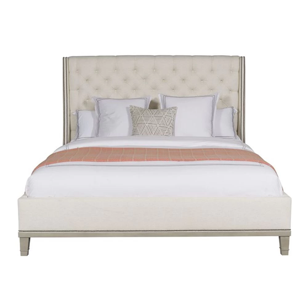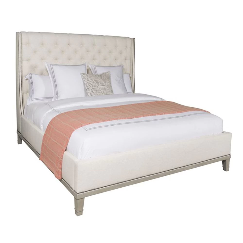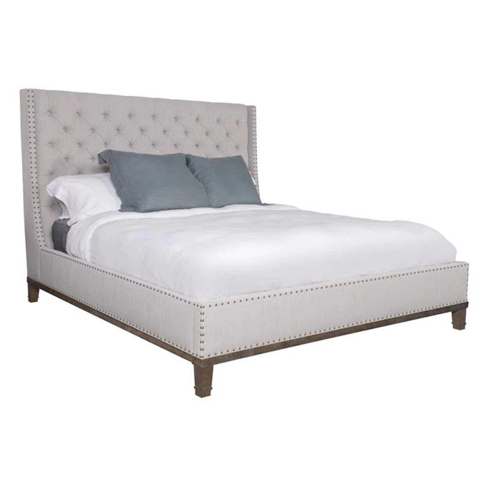 Upholstered tufted King bed with wood trim and legs, nailheads on headboard, and slat mattress support.