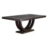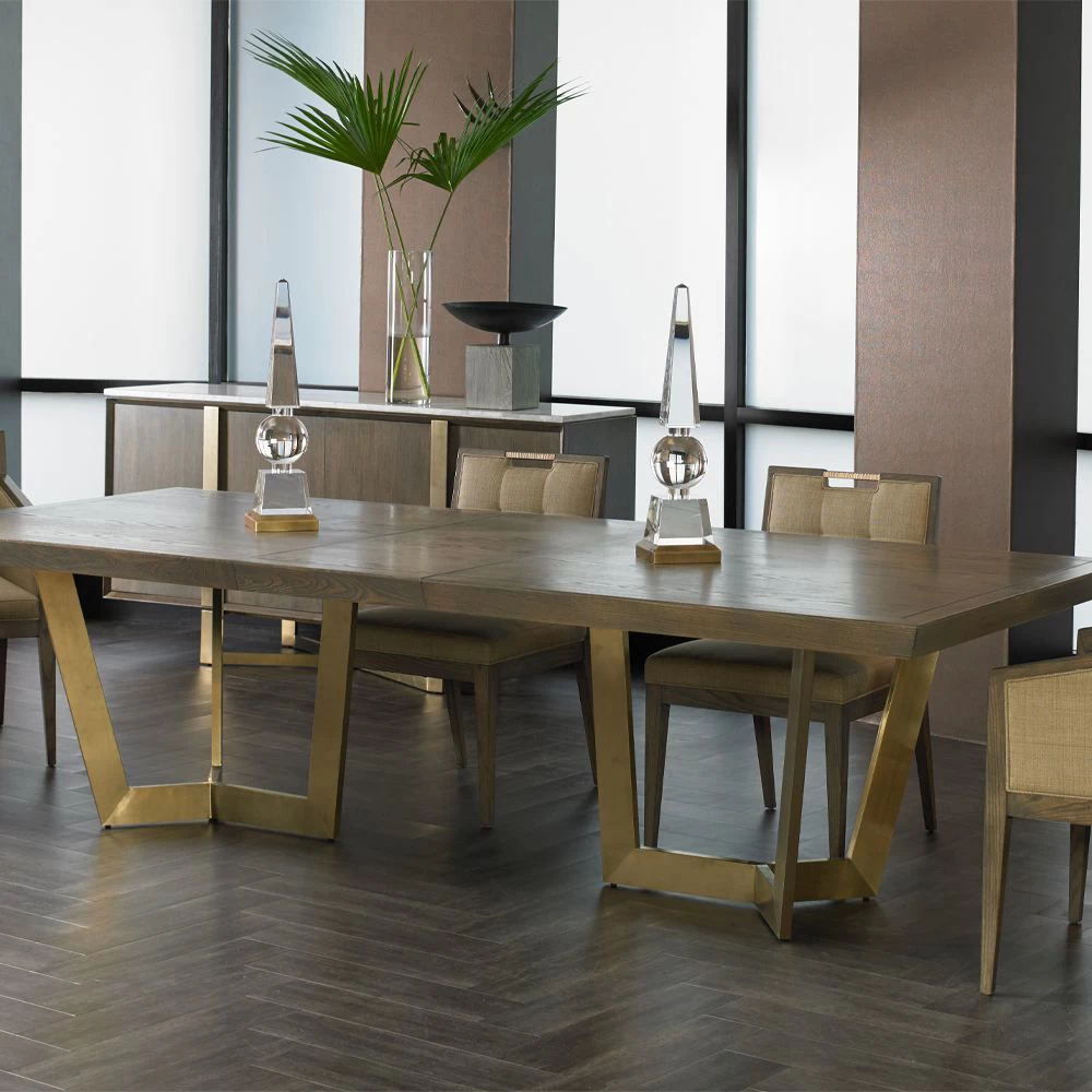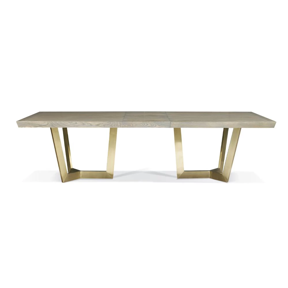 Rectangular Ash and Oak dining table top with metal pedestal bases in Champagne Bronze finish. Shown in select Truffle (-K4) Sandblasted finish. Includes one 20″ leaf (opens to 110″w).