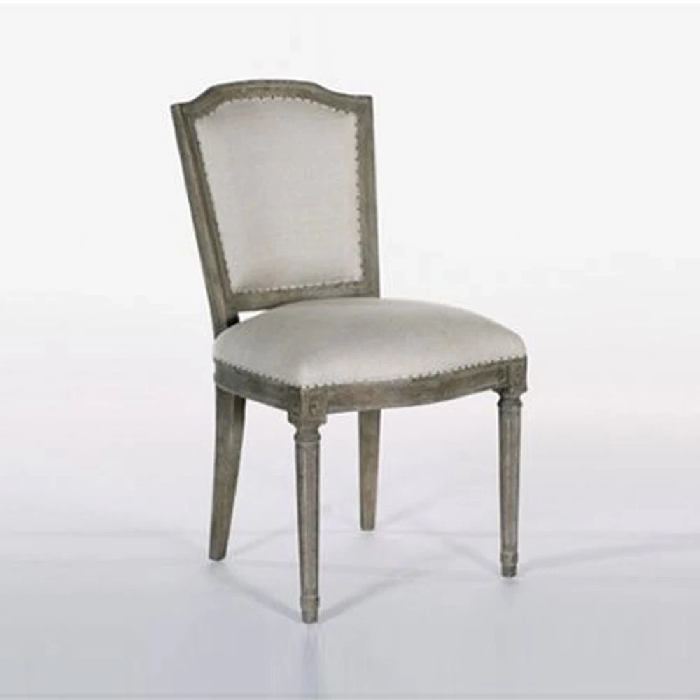 Distressed finished period chair in weathered oak finish with beige linen fabric. (Discontinued product).