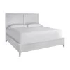 Upholstered King shelter bed with 54h headboard, nailhead trim, Espresso finished legs and slat mattress support.