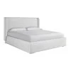 Upholstered Queen shelter bed with 54h headboard, nailhead trim, Espresso finished legs and slat mattress support.