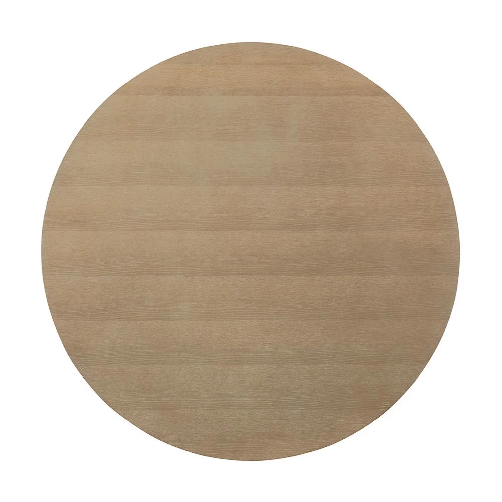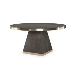 Round oak dining table with Railroad Silver finished metal trim around top and base edge. Available in a range of finishes.