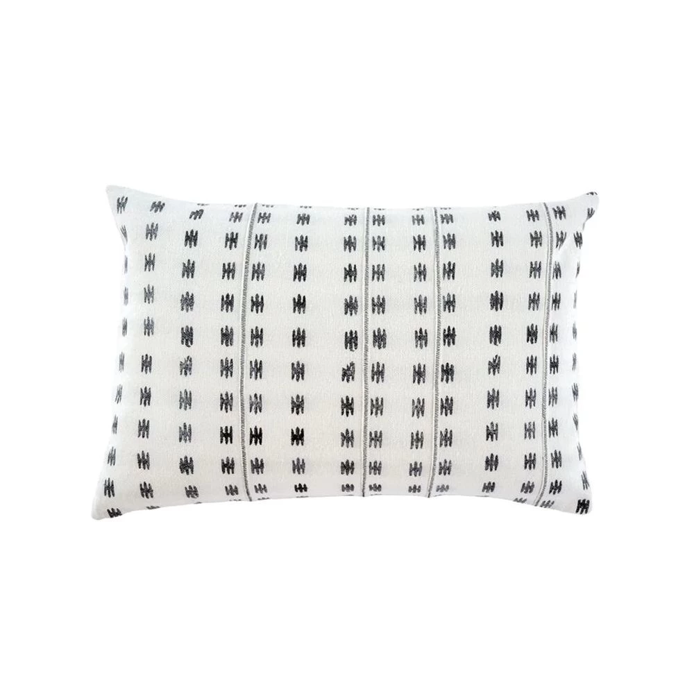White kidney pillow in cotton slub fabric with Charcoal block print pattern. Complimented with a solid cotton backside and premium down fill.