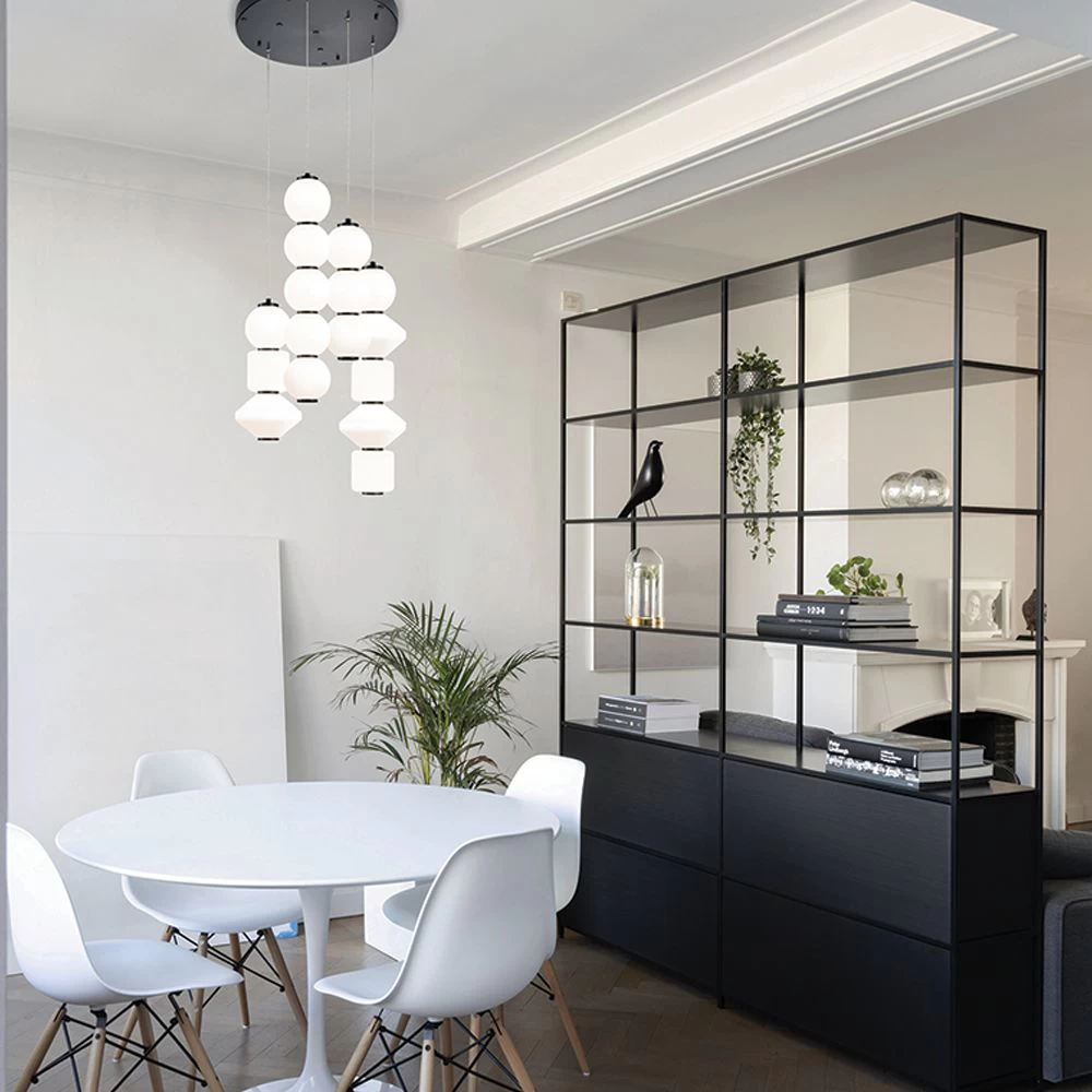 Oxidized Black finished pendant with Frosted White glass shades in various shapes. Also available in Oxidized Rose brass finish. Able to combine shapes into unique configurations.