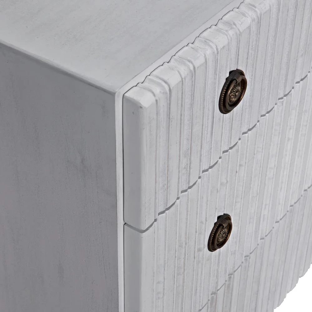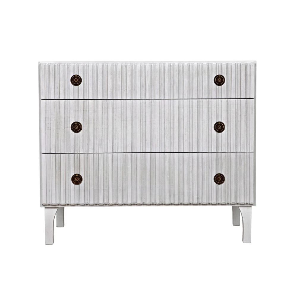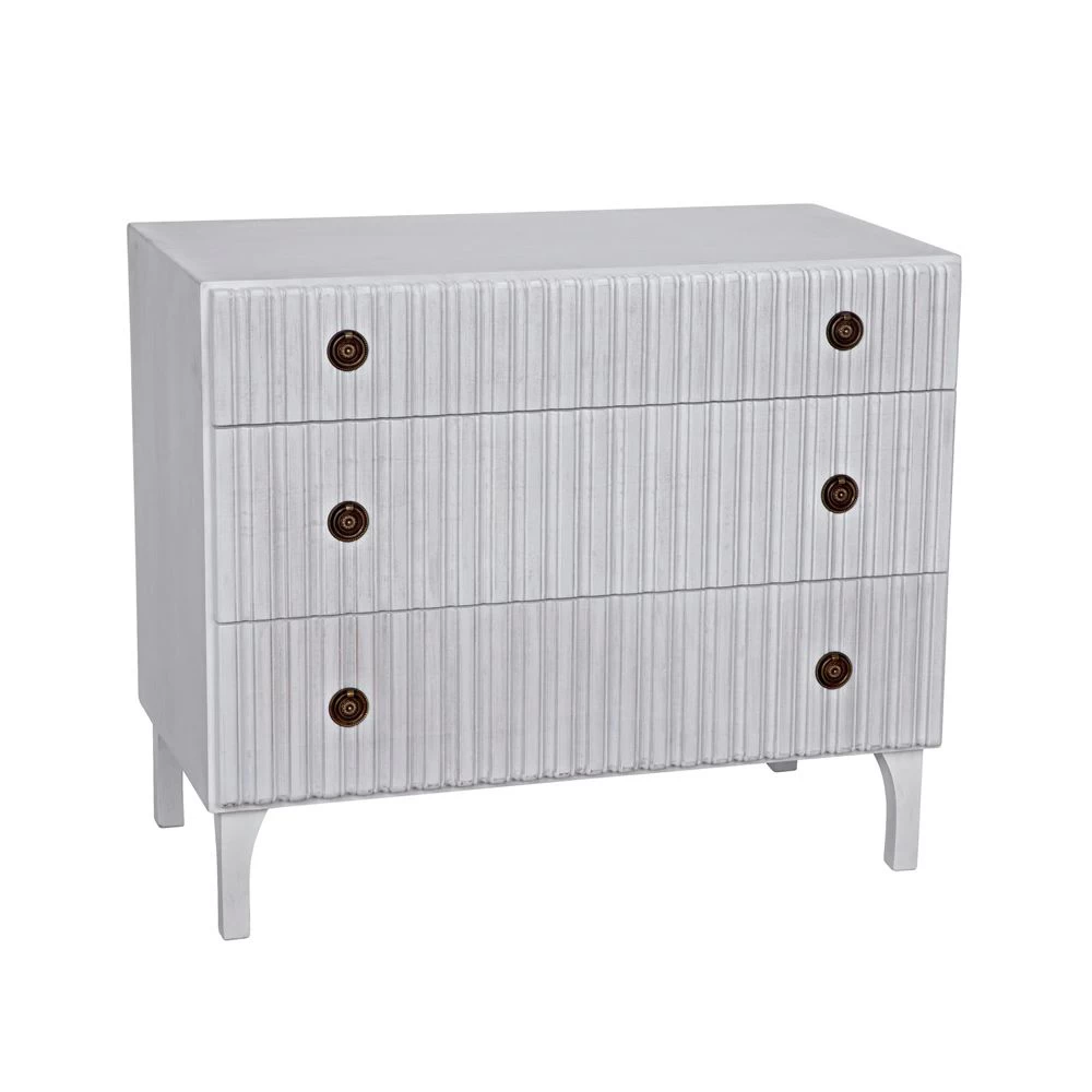 White wash finished mahogany 3-drawer dresser with ribbed front and brass accent hardware.