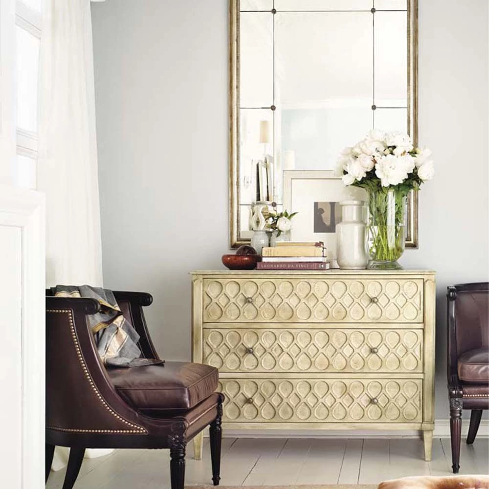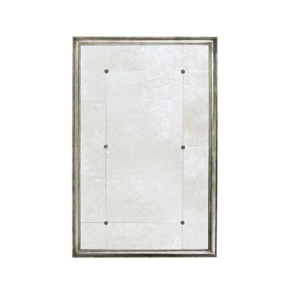 This impressively scaled mirror is made up of separate antiqued mirror panels attached with moulding rosettes and bordered by a silver-leafed and beaded frame.