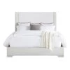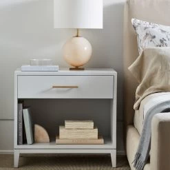 Single drawer custom nightstand in maple with tapered legs. Finished in BM Gray Owl OC-52 with 8″ Satin Brass pull hardware (MHP-8-SB).