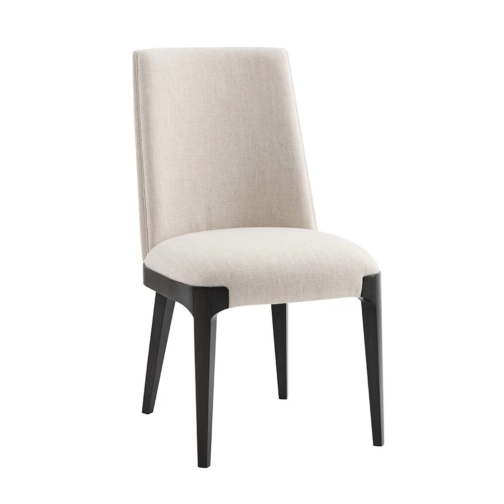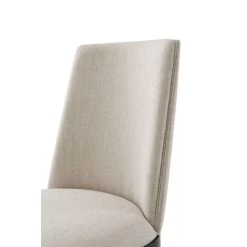 Upholstered dining side chair wilth scoop back and tight seat with Dark Macadamia finished Beech wood frame. Available only in Swathe fabric as shown.