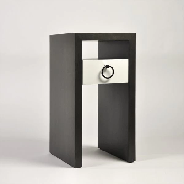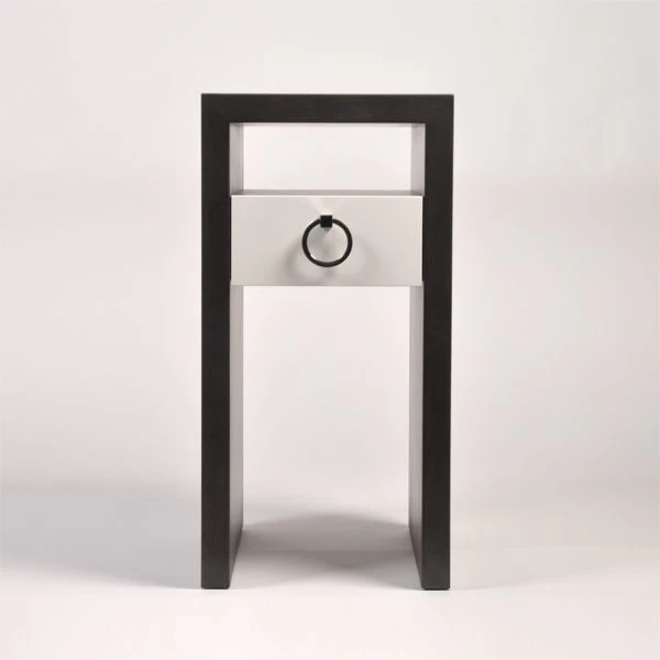 1 floating drawer nightstand in Maple wood finished in Jack Gray stain and Cocoon White painted drawer front. Polished Nickel R3″ Ring pull (RNG-3-PN).