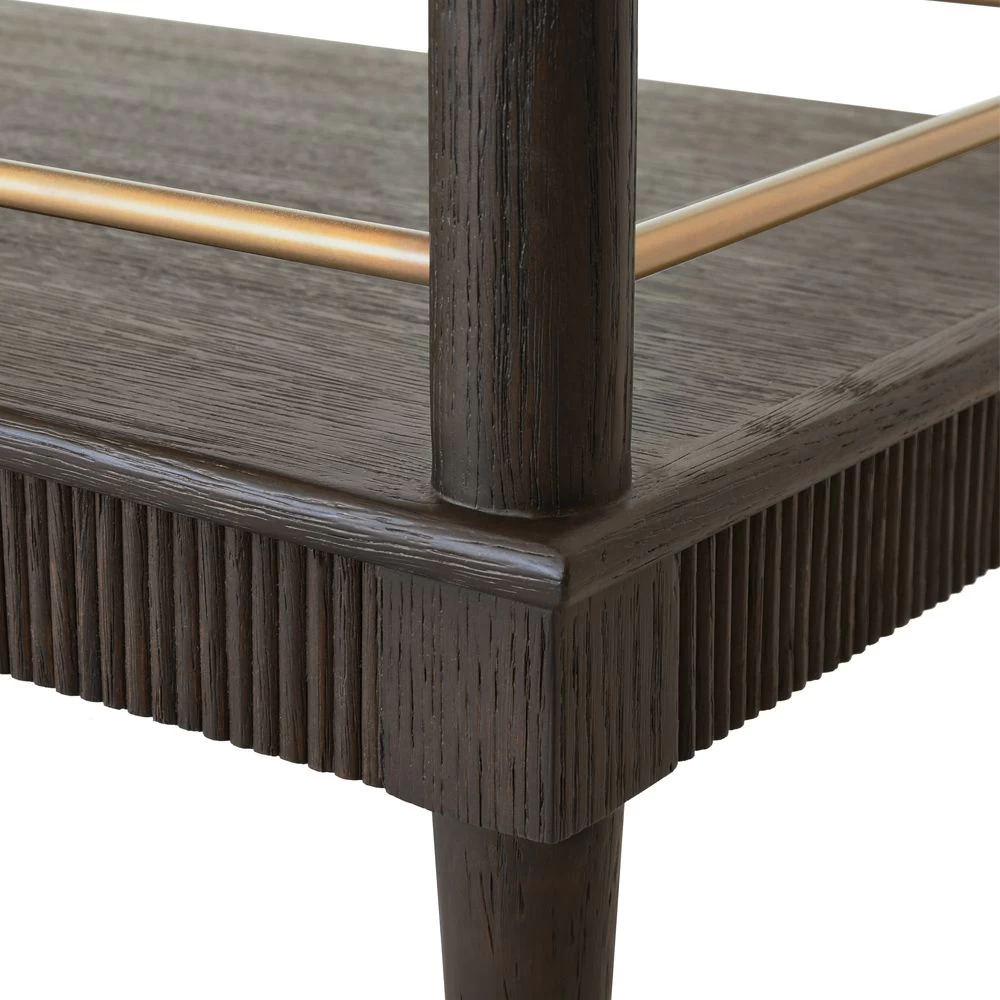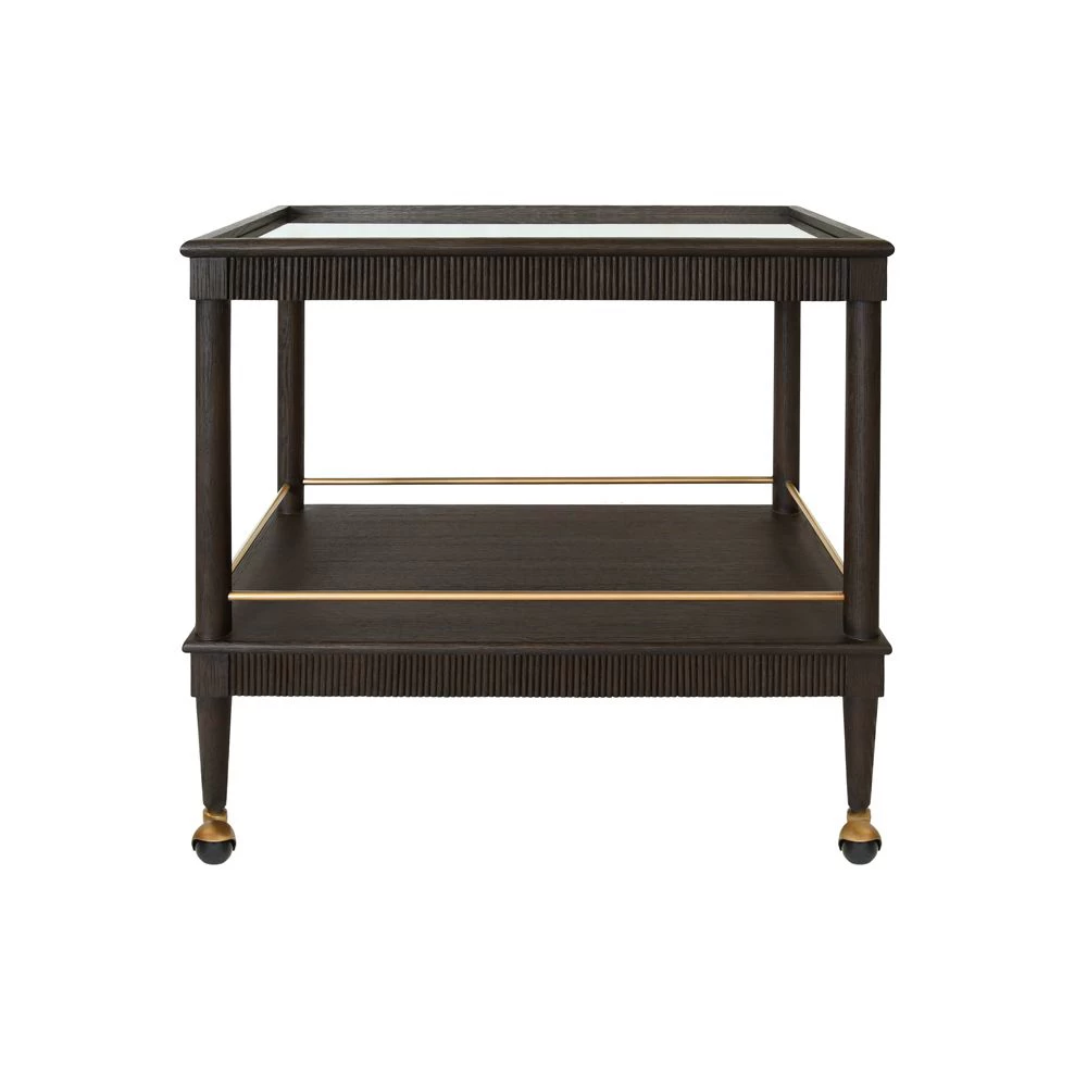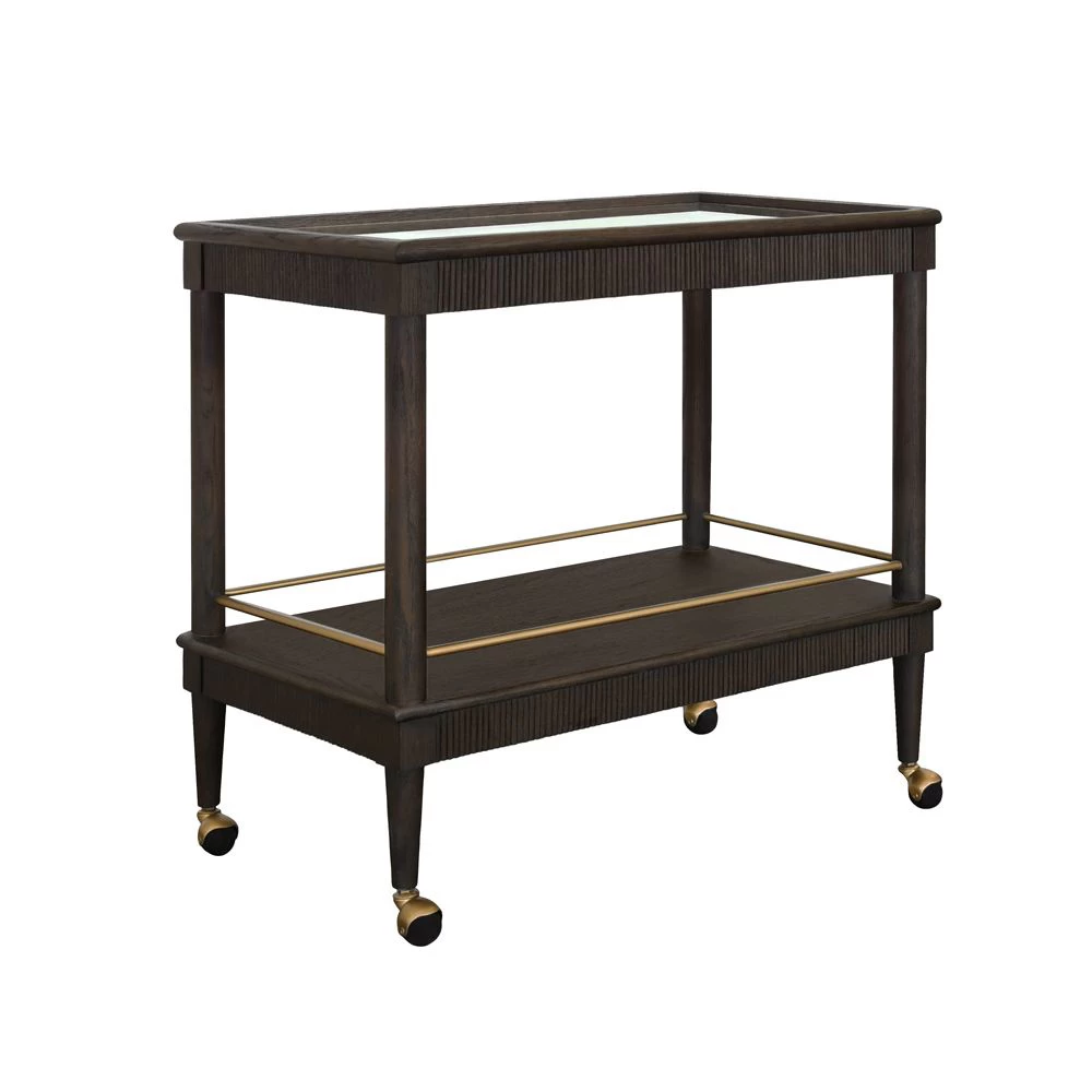 Espresso Black finished oak bar cart with ribbed details, brass accents and clear mirror tray surface.