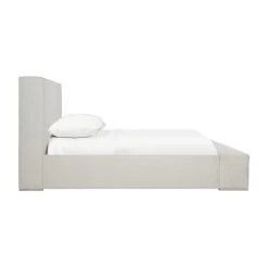 Fully upholstered king bed with block legs finished in Flaxen on White Oak. Complete with slat support system.