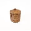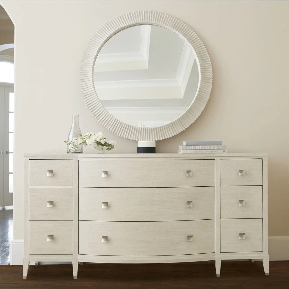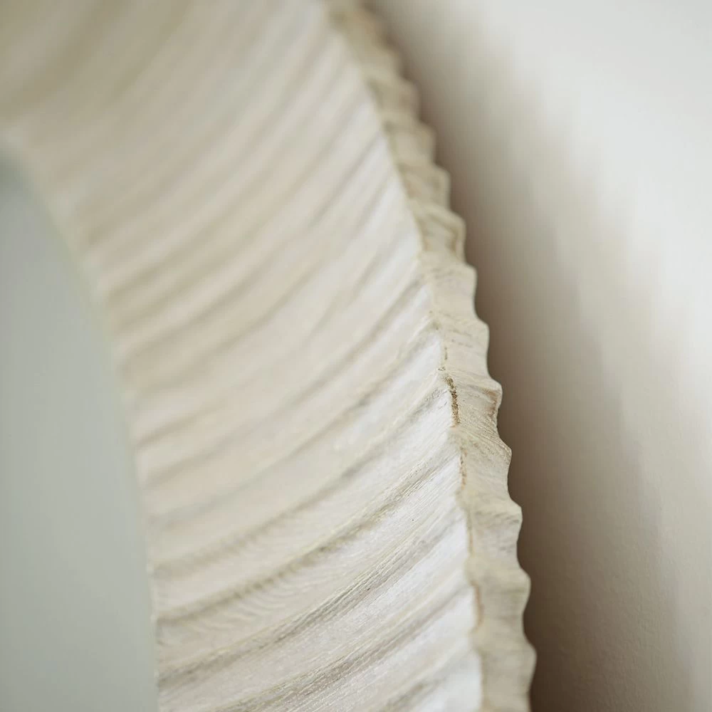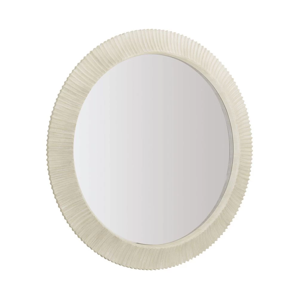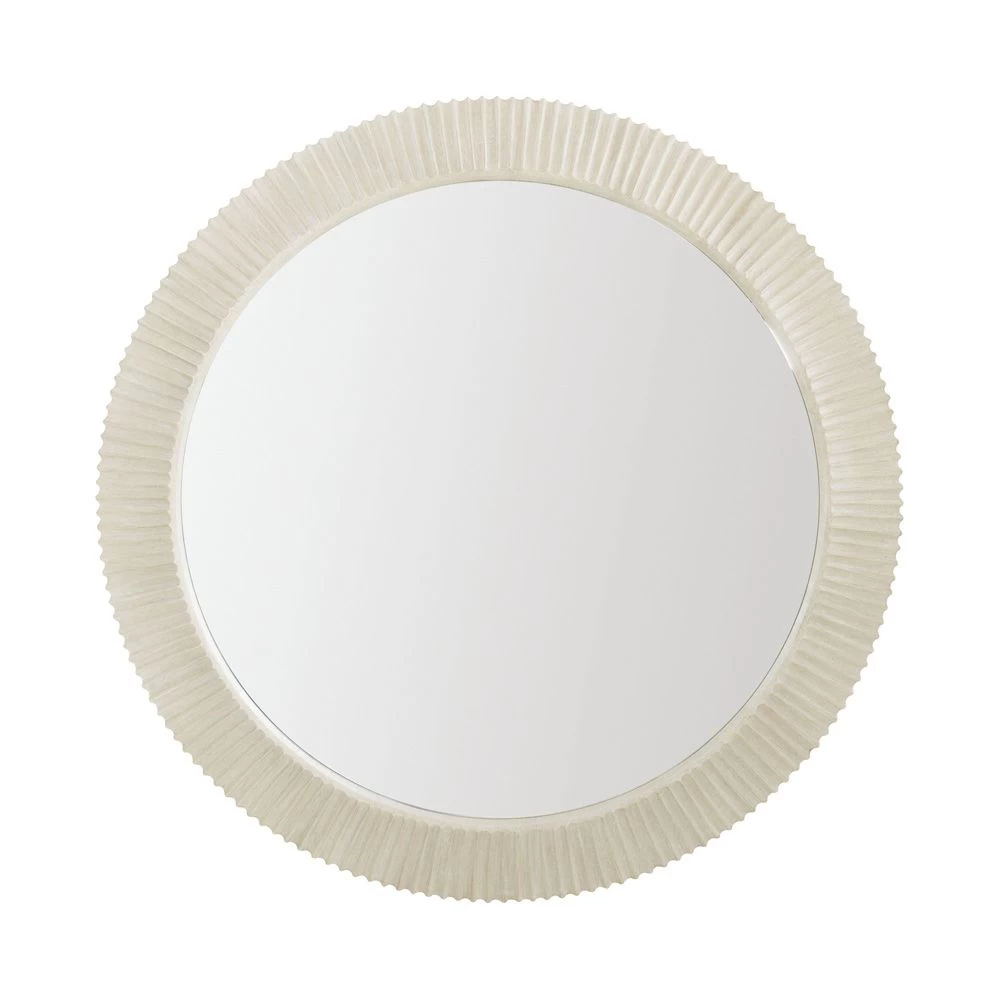 Round cast resin mirror with reeded frame and clear inset mirror.