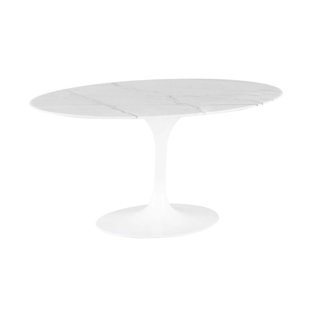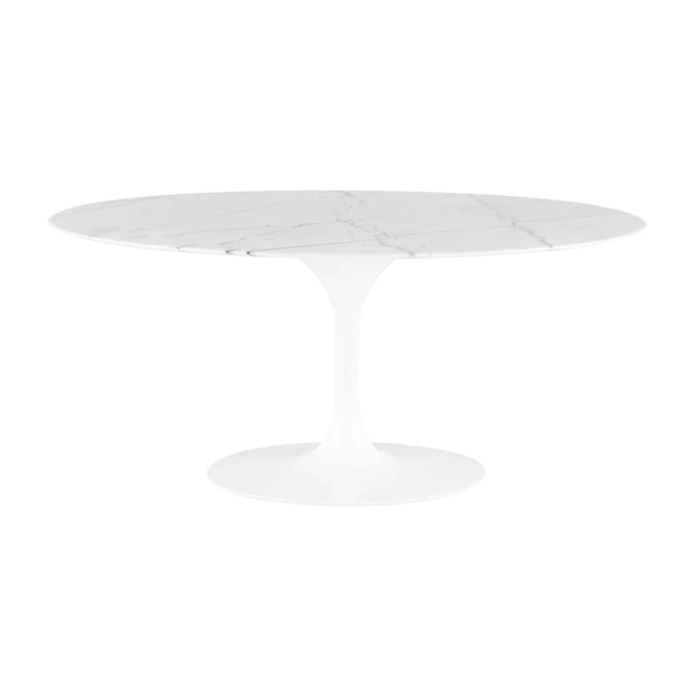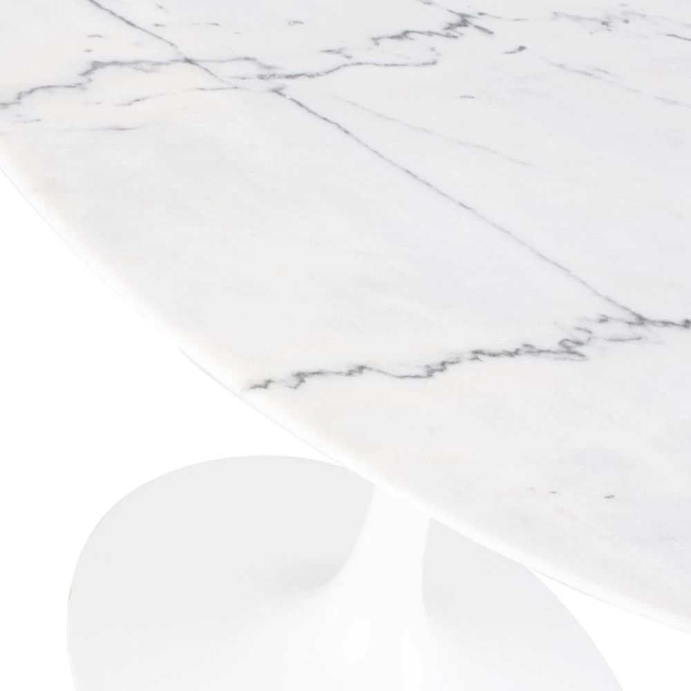Oval white marble dining table with white aluminium metal base. Table available in white marble, walnut or white veneer tops.