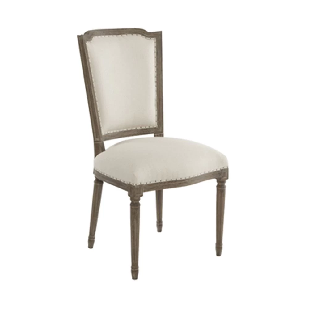 Burnished oak finished dining chair with light linen fabric seat and back. Burlap on outside back. (Discontinued product).