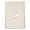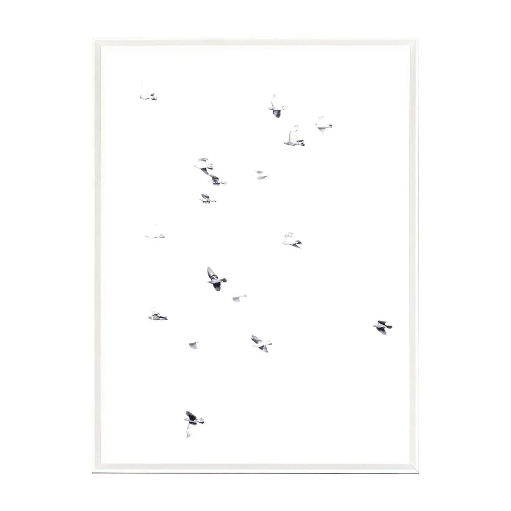 Birds in flight in white and black photograph framed in white acrylic with glass.