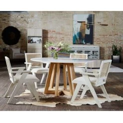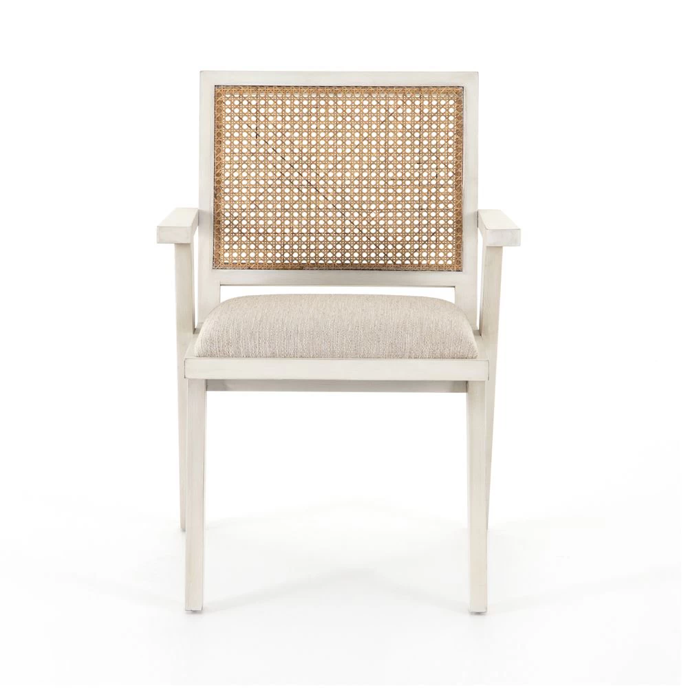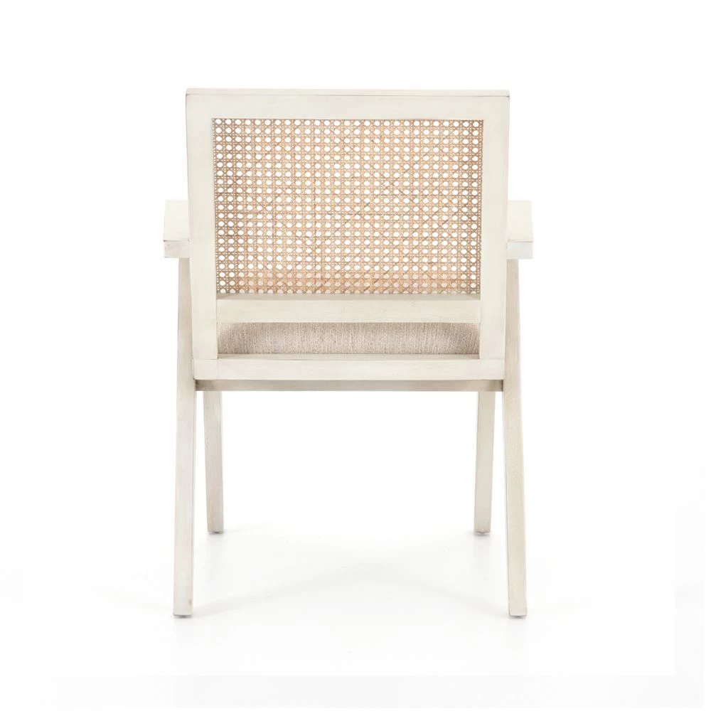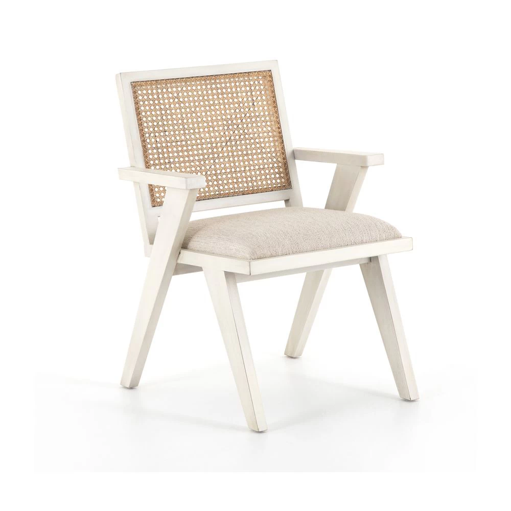 Distressed Cream finished dining side chair with natural cane back and upholstered seat cushion. Also available in Drifted Matte Black.